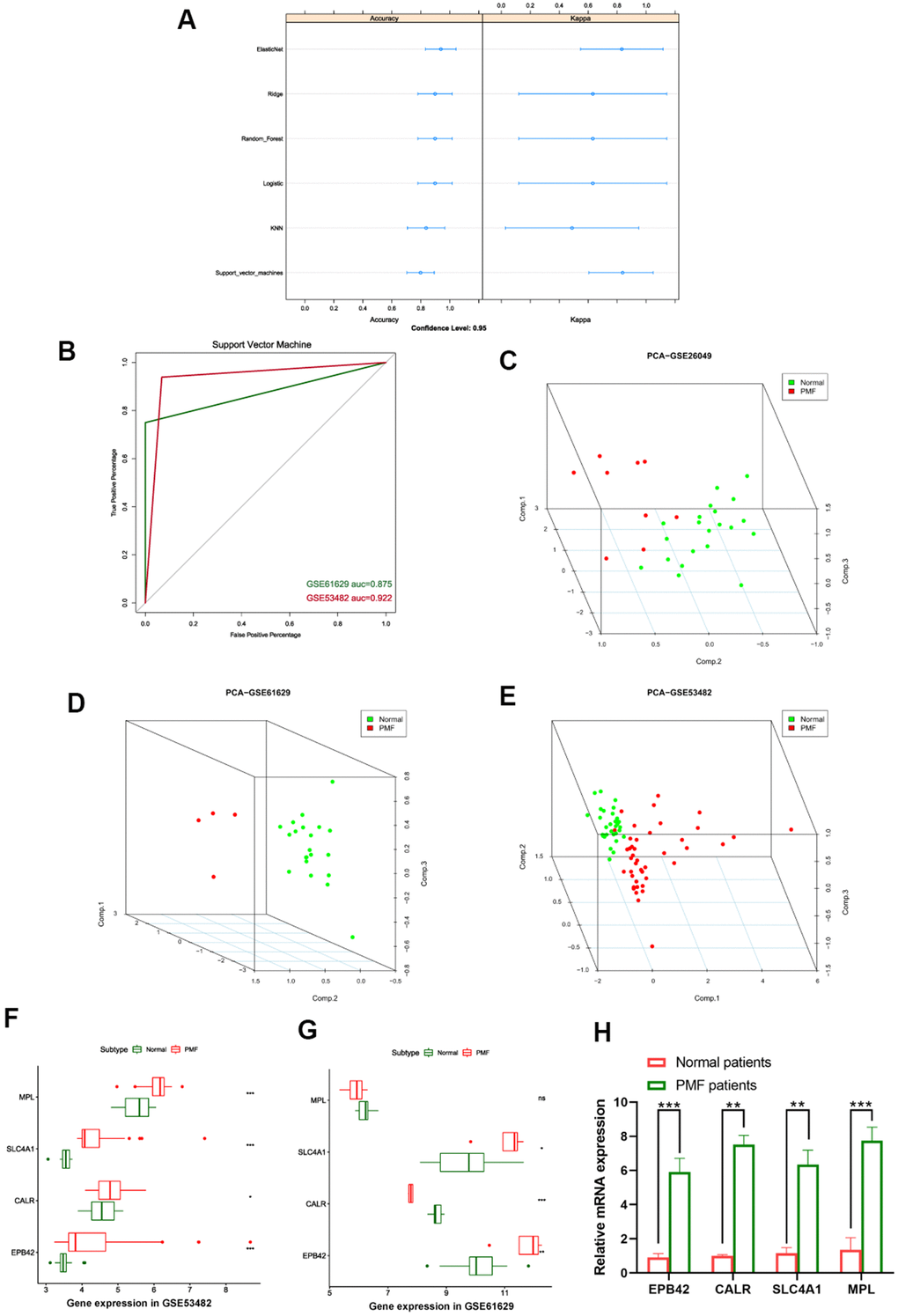 After EPB42, CALR, SLC4A1 and MPL were finally identified as hub genes of PMF, we established machine learning model to confirm the reliability of these genes, learning methods included Elastic Net regression, Ridge regression, Logistic regression, Random Forest, K-nearest neighbors, and Support vector machine models. Each of the machine model displayed high accuracy in Figure 9A. The most appropriate predicting model SVM (Support vector machine) was chosen as appropriate model and applied for testing sets in third party datasets, results were presented in Figure 9B, auc of GSE53482 and GSE61629 were 0.922 and 0.875, respectively.