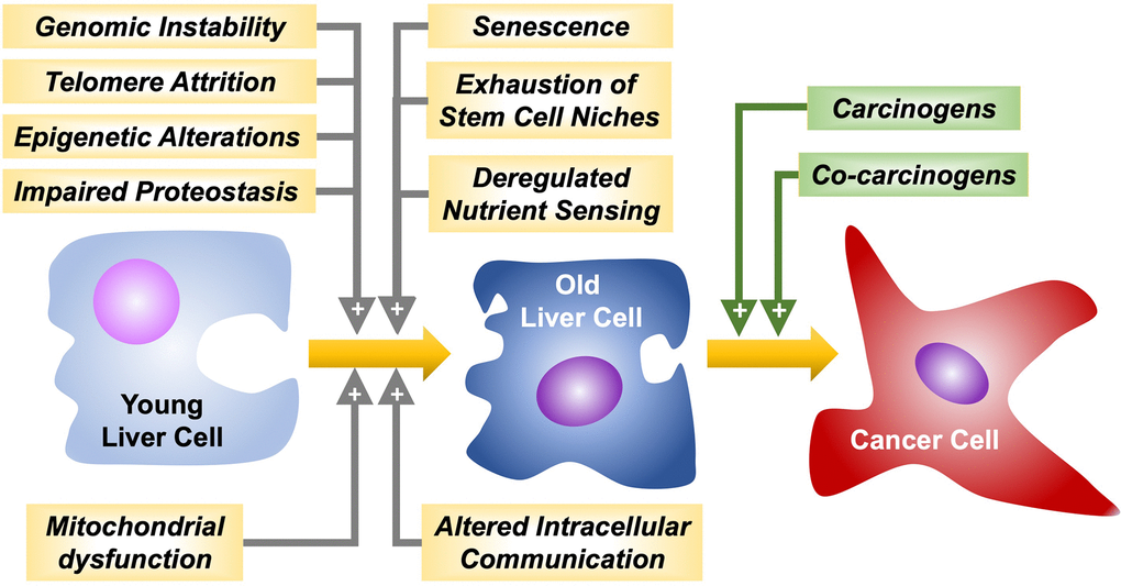 Aging is characterized by cellular senescence caused by the shortening of telomeres in successive cell divisions, which leads to a halt in the proliferation of somatic cells. Several processes such as DNA damage, epigenetic alteration, oxidative stress, mitochondrial dysfunction, and alteration of metabolic pathways can contribute to the senescence of cells and tissues and, at the same time, account for higher risk of liver cancer development [5].