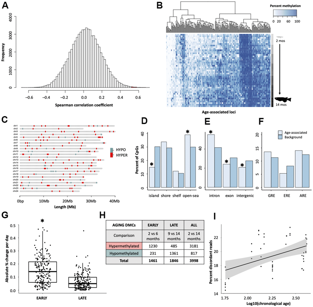 Genomic locations for age-associated cytosines determined by Spearman correlations were characterized using Galaxy’s coverage function (Galaxy Version 2.29.0) [65]. To determine the genic context of each cytosine, we used the medaka reference genome annotation (ASM223467v1) to assign cytosines as lying in introns, exons, or intergenic (not in exon or intron) regions. The genomic coordinates were compared against the age-associated cytosines and background cytosines using the coverage function in Galaxy (version 20.05) [65]. Similarly, CpG island (CGI) context was determined by first producing a BED file with CGI coordinates using Galaxy’s function cpgplot (Galaxy Version 5.0.0) [65] according to a sliding window of 100 bp (minimum size of CGI = 200 bp, Minimum average observed to expected ratio = 0.6, Minimum average percentage of G plus C = 50.0). Using bedtools ClosestBed (Galaxy Version 2.29.0) [65], we were then able to assign each cytosine to either a CpG island (within CGI), CpG shore (area of 2kb flanking CGI), CpG shelf (area from 2kb-4kb flanking CGI), or as an open-sea CpG (further than 4kb to nearest CGI). Enrichment above background was performed with binomial tests using the full dataset of 69,064 covered cytosines as the background.