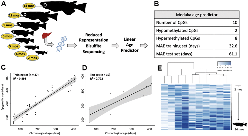 Training a linear model on the medaka DNA methylome revealed the highly predictable nature of age-associated remodeling (Figure 2A, 2B). We created a linear model by selecting 10 cytosines whose methylation patterns were the most highly correlated with chronological age (i.e. greatest Pearson correlation coefficients). This linear model performed well on the training set of 37 samples (R2 = 0.893; MAE = 32.6 days; Figure 2C) and was validated using a test set (n = 10) consisting of 1-2 samples per age group, selected at random (R2 = 0.722; MAE = 61.1 days; Figure 2D). When considered in the context of a 2-year lifespan, which is standard in our medaka population, this represents age-prediction accuracy within 8.4% of the lifespan. This linear model is largely (80%) comprised of cytosines which become hypermethylated with age (Figure 2E).