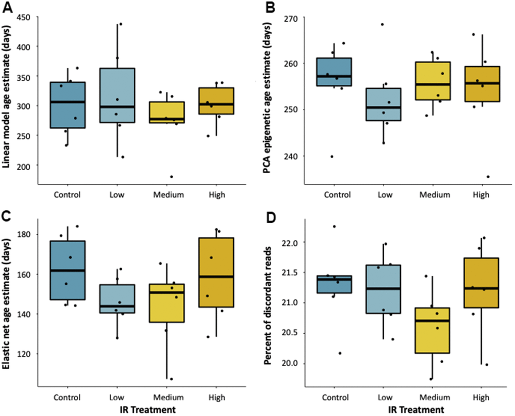 To test if exposure to an environmental stressor accelerates epigenetic aging, we applied all three of our epigenetic clocks to fish exposed to ionizing radiation for seven weeks at 5, 50, and 500 mGy/day in a Low Dose Irradiation Facility (LoDIF). There was no difference in age prediction in fish exposed to IR relative to unexposed controls (Figure 3A–3C). Additionally, IR exposure did not affect the percentage of reads with discordant methylation (Figure 3D), nor did it affect survival rate across treatments.