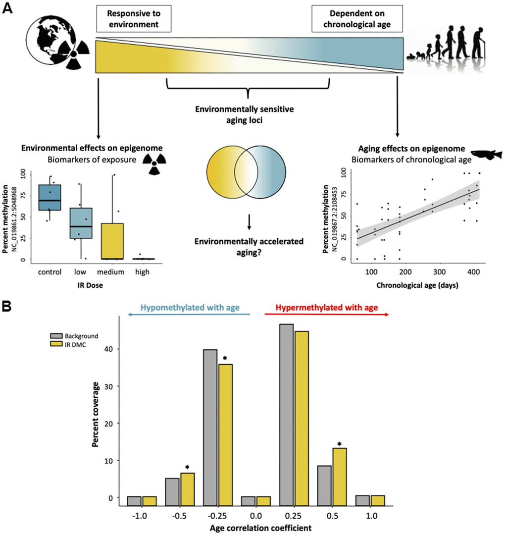While associations between epigenetic age acceleration and disease states are well established, the proximate mechanisms regarding how epigenetic aging interacts with environmental signals is not known. To address this, we investigate the physical convergence of environmentally induced changes and age-related changes across the DNA methylome. Here, we identify signatures of epigenetic aging by sequencing DNA methylomes of a well-studied teleost, the medaka fish (Oryzias latipes), and compare our findings to those observed in mammals. Medaka are ideal for this type of study due to their hardiness, short lifespan, and small genome [37]. We construct an epigenetic clock de novo based on age-associated changes to the DNA methylome and use an outdoor replicated mesocosm experiment to analyze how chronic exposure to ionizing radiation (IR) from gamma-emitting Cesium-137 sources affects normal epigenetic aging. IR is a ubiquitous environmental stressor under which all life has evolved and is a known source of DSBs [38]. IR exposures of less than 10 mGy/day are deemed to be safe for aquatic organisms, however, lower doses are known to cause biological effects [39]. Here, we analyze how a 7-week exposure to 5, 50, and 500 mGy/day of IR alters epigenetic aging with the hypothesis that IR exposure may result in epigenetic age acceleration via the induction of RCM. Collectively, our study advances our understanding of conserved epigenetic aging patterns in vertebrates, and highlights how environmental factors, like IR, influence the aging methylome to both disrupt and accelerate normal epigenetic aging.