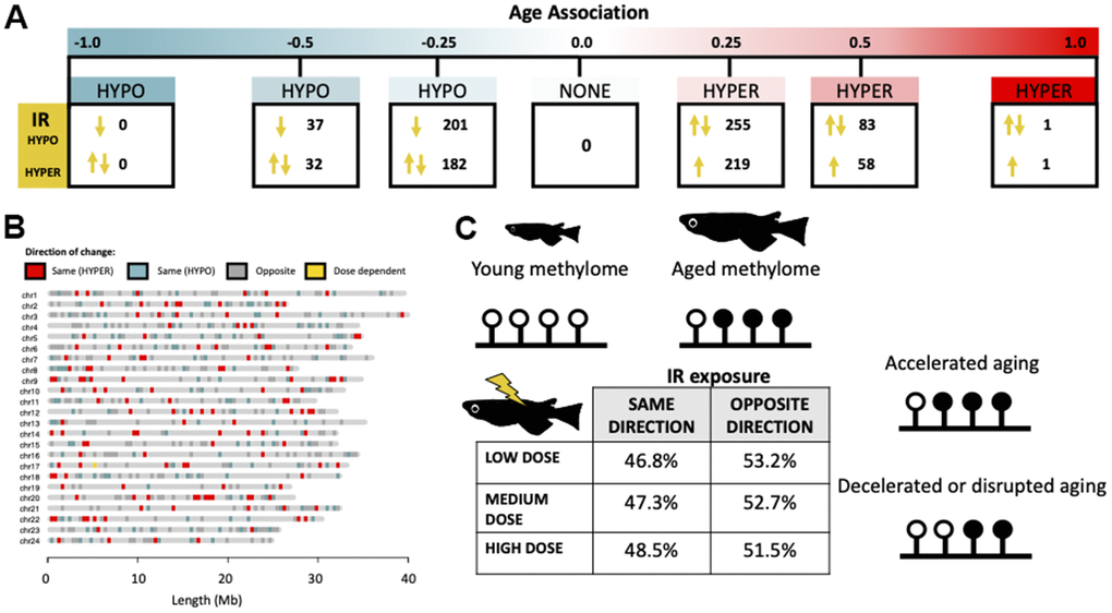 We further investigated the link between exposure to IR and epigenetic aging by assessing the directionality of IR-induced methylation in relation to changes occurring during normal aging. Of the cytosines which were both affected by IR and age (Figure 5A), we found that IR exposure resulted in methylation shifts reflective of both accelerated and decelerated epigenetic age (Figure 5A) and these effects are observed across the genome (Figure 5B). Interestingly, there is an increased incidence of IR exposure resulting in deceleration of normal epigenetic aging in cytosines with weak positive age-associations, ranging from zero to 0.25 (p = 1.3e-05) and 0.25 to 0.5 (p = 0.043; Figure 5A). There were no dose dependent effects on the direction of change (Figure 5C).
