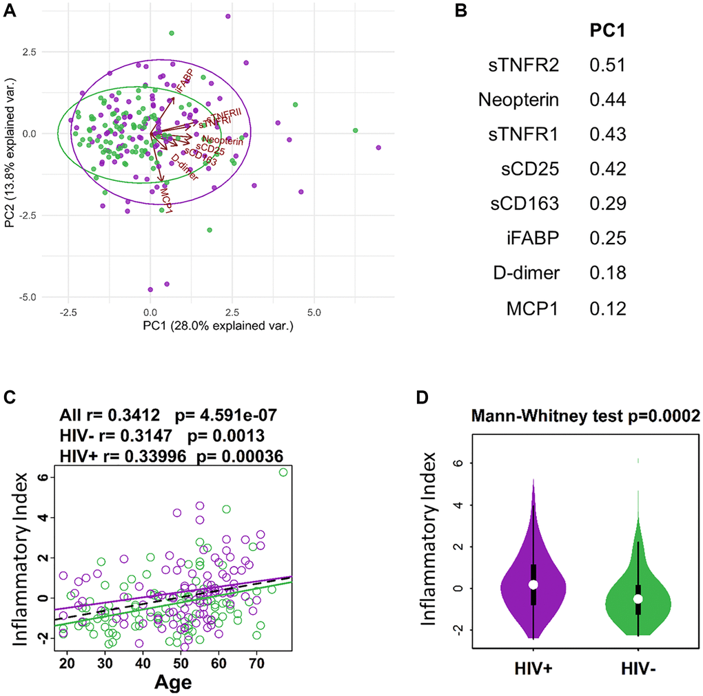 Inflammation and immune activation are independently associated with chronic HIV infection and an aging immune system. Thus, to study the effect of aging in the context of ART-treated HIV infection we performed the current study in participants from the Flu Responses of People in Relation to Age and HIV (FLORAH) study [19]. The age ranges of participating HIV-infected, ART-treated virally suppressed adults (n = 106) and HIV-negative, healthy controls (HC, n = 103) are shown in Table 1. Cell-free biomarkers associated with inflammation and immune activation (listed in Supplementary Table 1) were measured cross-sectionally from plasma collected at pre-vaccination in the related influenza vaccination study [7]. The panel of biomarkers selected for analysis were chosen to evaluate inflammatory cytokines and soluble receptors as well as markers of microbial translocation [21, 22]. Data reduction using Lasso was performed to generate an ‘Inflammatory Index’ containing only the biomarkers that most closely associated with age. This approach resulted in a group of 8 cell-free biomarkers with which the Inflammatory Index was calculated as the sum of the standardized variables of each biomarker multiplied with their weights extracted from principal component analysis variable PC1 (Figure 1A). Soluble TNF receptors 1 and 2 showed high contribution to the index, along with Neopterin, D-Dimer, soluble CD25 and CD163 receptors, MCP1, and iFABP (intestinal fatty acid binding protein) (Figure 1B). The index showed a significant but weak correlation (r value <0.4) with age in both HIV and HC (Figure 1C) and by comparing the groups regardless of age the index was higher in HIV compared to HC (Figure 1D). These results show that markers of inflammation that increase with age in the general population, are also higher in HIV-infected individuals supporting the hypothesis that HIV infection can enhance the process of inflammaging [23].