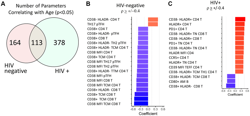 The remaining 35 parameters had opposite directionality in association with age in HC and HIV (Figure 3B). In B cells, frequencies of CD80+ cells increased with age in HC and decreased in HIV, meanwhile FcRL4+ B cells decreased in HC and increased in HIV. In T cells, the markers that were differentially associated with age were CTLA4, PD1, and Ki67 expressed in CD4 T cells. These markers decreased with age in HC and increased in HIV. Overall, the univariate analysis demonstrated that T cell phenotypes, especially CD38 expression, that correlate with age in HIV-negative population are maintained in HIV+ individuals on ART though at a lower magnitude. While certain parameters with opposite associations with age in the HIV population reflect an altered aging pattern and may be important biologically.