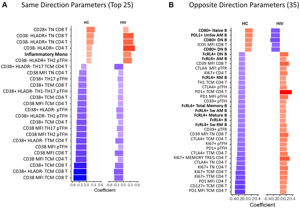 Combination of all parameters from the HC-trained model and HIV-trained model allowed us to generate an alternative model to predict age in both participant groups (Figure 5A). The results from the combined model highlight the difference in markers that associate with age in HIV. For example, CD38+ HLADR+ TTM CD4 T cell frequencies were positively associated with age in HIV but showed minimal association in HC. PD1 expression on T cell subsets showed stronger associations with age in the model for HC, but weakened or opposite associations in HIV.