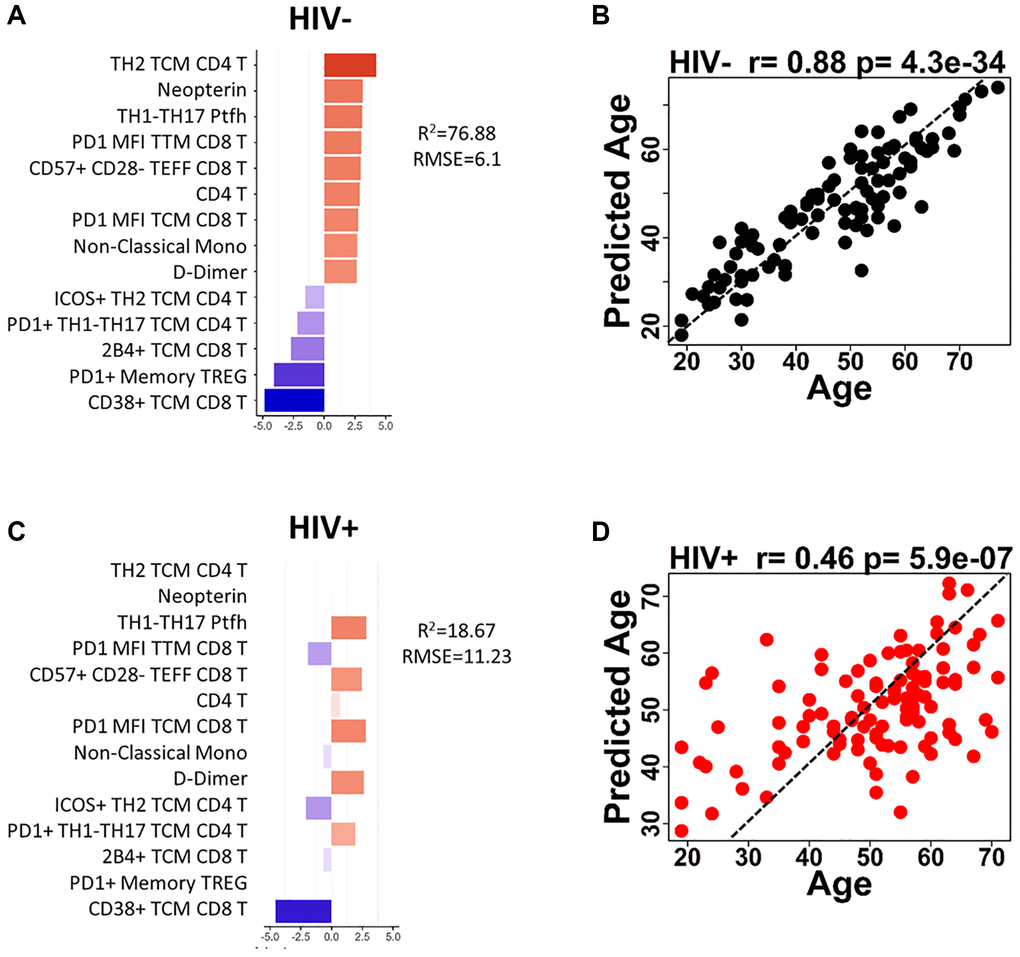 The same procedure was performed to determine whether a different set of immunological parameters could be used to predict age in the PWH group with greater accuracy. The modeling generated a 15-parameter model to predict aging in HIV, however it was weakly predictive with an r2 of 55.44% and RMSE 8.4 (Supplementary Figure 1).