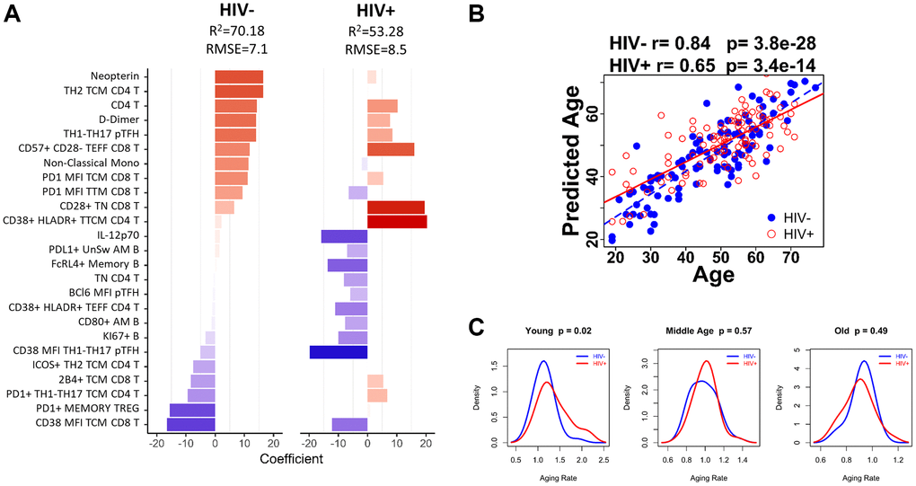 Initial aging model was tuned to get best prediction on age using Microsoft Azure Machine Learning Studio. Model tuning was performed on 70% train and 30% test in HC and HIV separately. Cross-validation was performed by 5 or 10 folds. Markers were evaluated by their permutation feature importance. Optimal model was selected by minimum averaged RMSE and highest Coefficient of Determination (R-squared). Optimal model was further tuned on 4 machine learning algorithms (Linear regression, Neural network, Decision Forest regression, boosted decision tree). Linear regression generated best prediction.