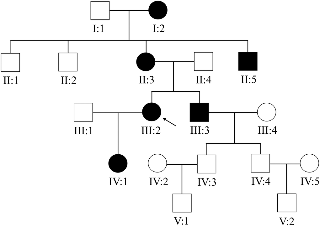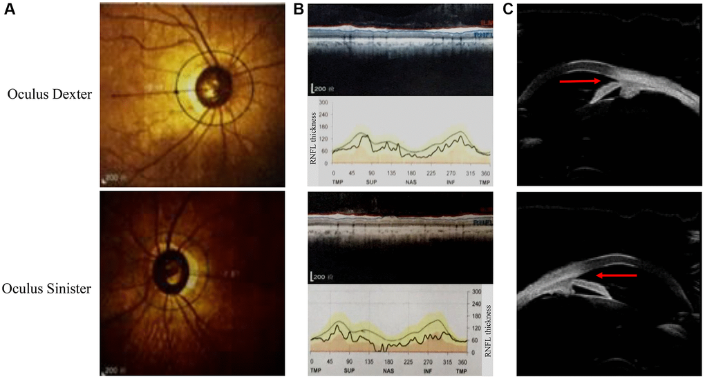 This Chinese PACG family (Figure 1) comprises 18 members (10 males and 8 females). The proband III:2 at the age of 49 (black arrow) was enquired about a family history of glaucoma. The accuracy of family history information was confirmed by the corroboration of relatives attending the hospital. I:2 had been treated with conservative drug therapy for ocular hypertension for 35 years from age 60. On examination, all affected members were found to have the same phenotype as the proband III:2. The thickness of the optic nerve fiber layer in both eyes was significantly thinner. Direct contact of the iris root with the trabecular meshwork led to a closure of the anterior chamber angle (Figure 2). The proband’s mother II:3 and her uncle II:5 underwent surgery for glaucoma. This family has a strong history of glaucoma.