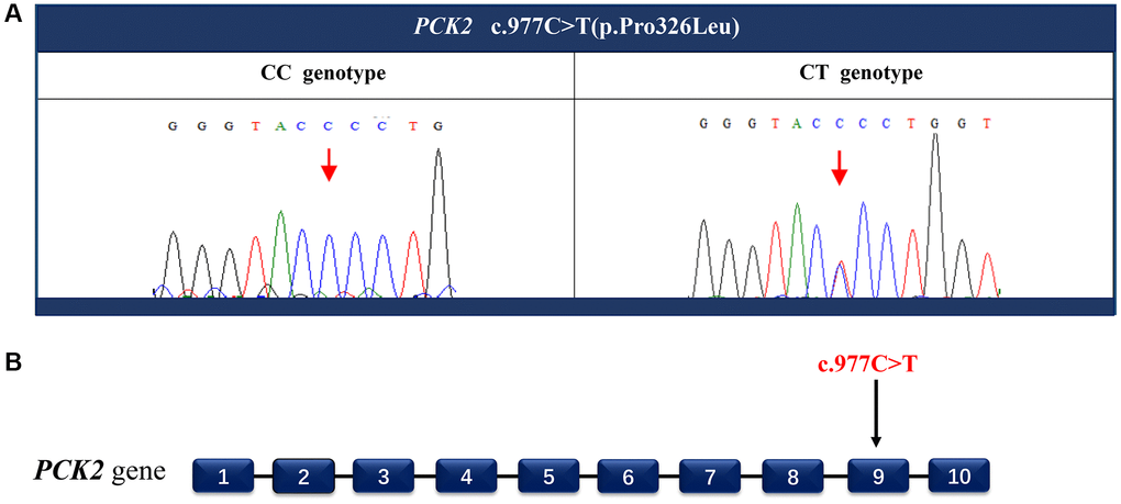 The whole-genome sequencing was performed to identify the disease-causing mutation. By using ClinPred, an efficient tool for identifying disease-relevant nonsynonymous variants, 18 variants (the scores >15) were identified as possible disease-causing mutations (Table 1). Sanger sequencing was applied to screen these potential pathogenic variants. A cytosine (C) to thymine (T) heterozygous missense mutation c.977C>T in phosphoenolpyruvate carboxykinase 2 (PCK2) gene was detected in all five affected family members (Figure 3), but not in any of the unaffected members and 86 unrelated individuals. The C to T nucleotide change at this locus is predicted to result in proline (P) to leucine (L) substitution p.Pro326Leu.