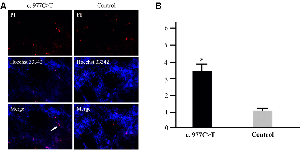 The effects of c.977C>T mutation on cell apoptosis were quantitatively analyzed by flow cytometry. RGC-5 cells in the logarithmic growth phase were inoculated into 6 cm dish and cultured for 48 hrs until the cells adhered to the wall. Following incubation, the cell culture medium was collected in a 10-mL centrifuge tube, and the cells were washed with PBS. Subsequently, the cells were centrifuged to remove the supernatant, re-mixed with binding buffer, and mixed with Annexin V-FITC and propidium iodide (PI) staining solution. After thorough mixing, the cells were incubated at room temperature in the dark for 15 min. PBS was added to the flow tube cell suspension, and a flow cytometry assay (Beckman Coulter) was performed.