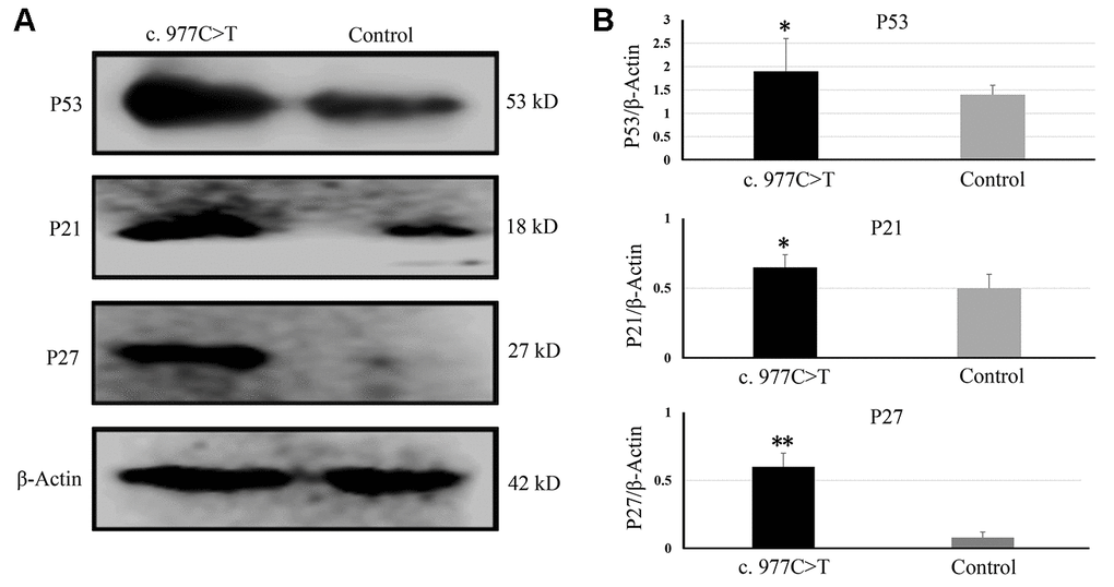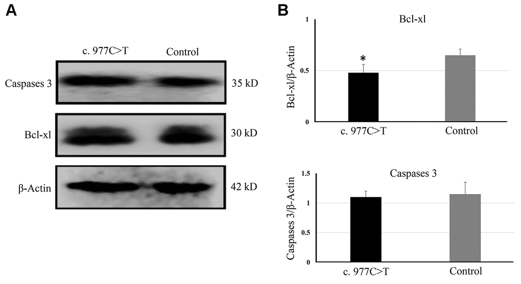 To further explore the effect of mutation c.977C>T, the mutation was constructed into lentiviral vector pCD513B and transfected into RGC-5 cells. The c.977C>T mutation induces apoptosis of RGC-5, suggesting that c.977C>T mutation is a function-loss mutation. A decreased Bcl-xl indicates that c.977C>T mutation induces apoptosis by regulating the Bcl-xl induced-apoptosis pathways. Bcl-xL is a transmembrane molecule in the mitochondria, which acts as an anti-apoptotic protein by preventing mitochondrial release, leading to caspase activation and programmed cell apoptosis [21–22]. In addition, elevated P53, P21, and P27 were observed in RGC-5 cells transfected with c.977C>T mutation. P53 and its primary target P21 is linked with DNA damage to cell cycle arrest [23–24]. P27 is a negative regulator of cell proliferation and arrests the cell cycle by inhibiting cyclin-dependent kinases [25]. All of these proteins have been widely confirmed to be involved in cell cycle arrest to cell apoptosis.