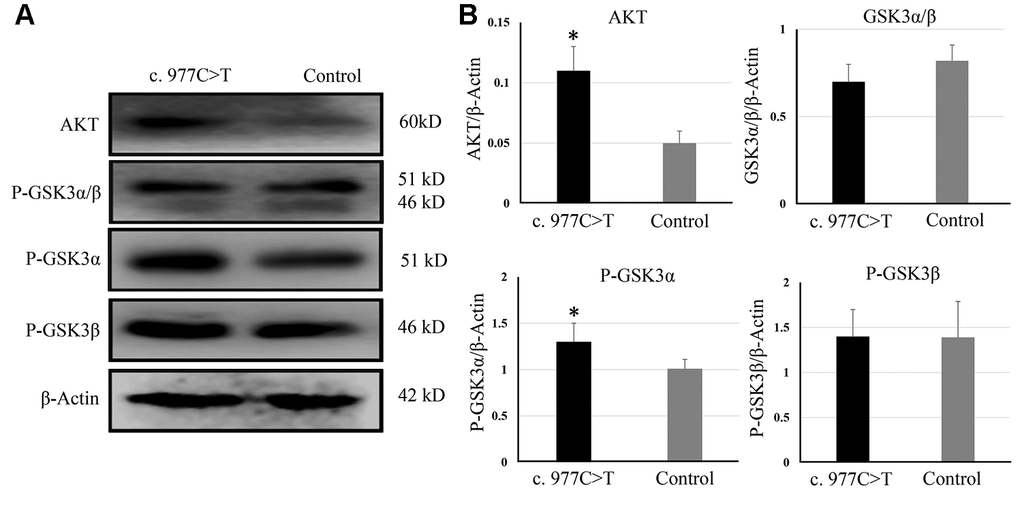 To further investigate the function of PCK2 and determine the activity of the mutation on endogenous target genes, RGC-5 cells were stably transfected with constructs expressing PCK2 with c.977C>T mutation. The mutation induces apoptosis of RGC-5, which was demonstrated by Hoechst 33342/PI double-fluorescent chromatin staining (Figure 4A) and flow cytometry (Figure 4B). In order to explore the mechanism of c.977C>T mutation-induced apoptosis, the levels of proteins associated with cell apoptosis were determined by Western blotting and quantitative analysis. A decreased BcL-XL was detected in RGC-5 cell lines transferred with c.977C>T mutation (Figure 5). To further investigate the effect of c.977C>T mutation on RGC-5 cells, the expression of P53, P21, P27, AKT, and GSK3 were measured. The elevated P53, P21, and P27 were observed in RGC-5 cell lines transferred with c.977C>T mutation (Figure 6). In addition, we found that the expression of AKT and phosphorylation of GSK3α were increased (Figure 7).