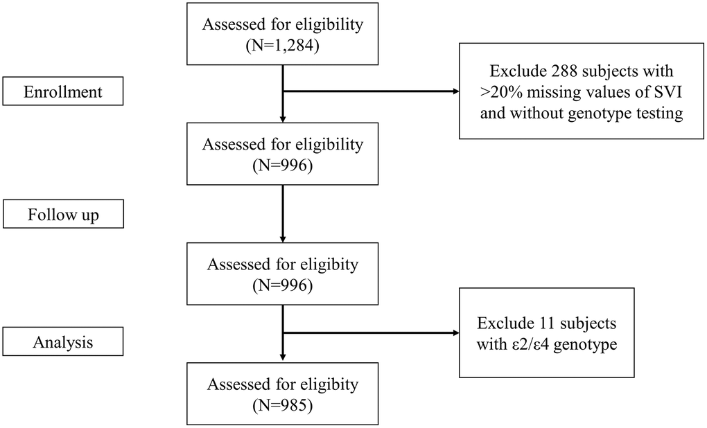 In this study, we constructed the SVI from a nationally representative population-based cohort in Taiwan, and the SVI developed from this study presented similar features to those noted in previous studies [12, 31]. This study clearly identified different demographic and clinical characteristics among participants with different SVI levels. SVI status significantly predicted all-cause mortality after adjustment for confounding factors, including ApoE and 5-HTTLPR genotypes. Nevertheless, some differences existed in the distribution of ApoE and 5-HTTLPR genotypes in association with SVI. Specifically, higher chances of harboring the ApoE ε4 allele were noted in the high SVI group, but no differences in 5-HTTLR were noted across different SVI levels. The mortality risk was significantly higher among ApoE ε4 noncarriers in the high SVI group than ApoE ε4 noncarriers in the lower SVI group and ApoE ε4 carriers with any SVI status. The results suggested the moderating effects of ApoE genotypes on SVI in predicting all-cause mortality in the study participants. However, a similar relationship was not observed between 5-HTTLPR genotypes and SVI.