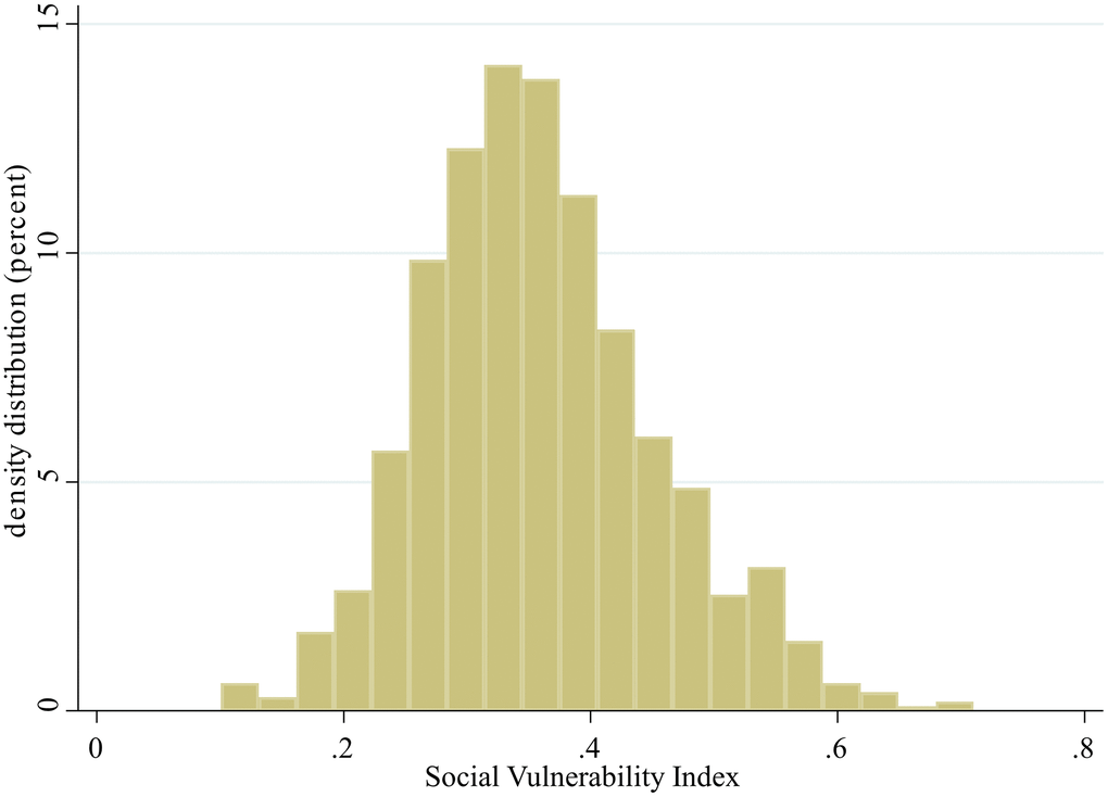 The SVI was developed based on cumulative deficit theory [12]. Among all study variables of SEBAS, we selected 32 parameters from social perspectives, including social support, social engagement, personal mastery, marital status, education attainment, socioeconomic status and two instrumental activities of daily living items associated with community participation, to construct the SVI (Supplementary Table 1). For binary social deficits in each respondent, a score of 0 was assigned if the deficit was absent, and 1 was assigned if the deficit was present. Intermediate values were assigned scores ranging from 0 to 1 to generate an ordered response. For example, for the “living alone” question, an individual scored 1 if the answer was “yes” and 0 if the answer was “no”. As another example, the question “in the past week, do you feel people around you weren’t nice to you” had four response categories. A score of 0 was assigned if the answer was “no”, 0.33 for “rarely”, 0.66 for “sometimes” and 1 for “often”. Subjects with >20% missing values of the deficit items were excluded from the analysis. The SVI value was obtained by the sum of the deficit scores and then divided by the total number of total deficit items to yield a comparable score ranging from 0 to 1. The higher the SVI score, the more severe the increase in social vulnerability.