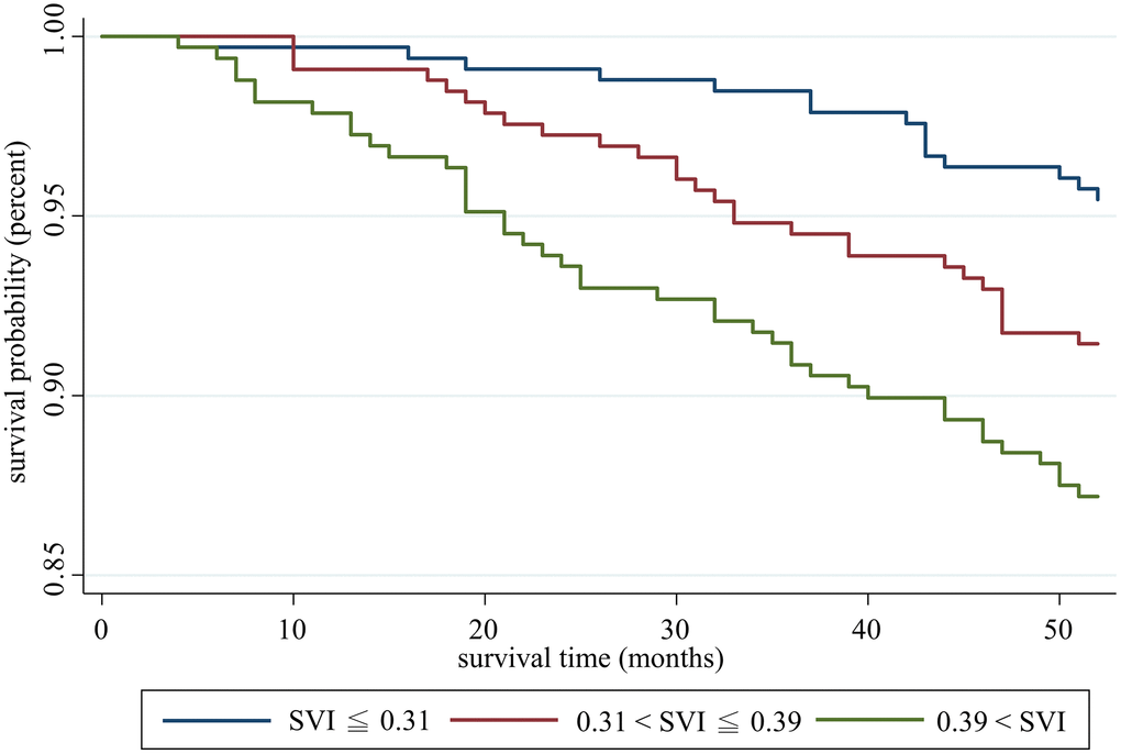 The average time of follow-up was 50.11 ± 7.40 months, and 85 deaths were recorded. Kaplan-Meier analysis showed a significantly lower survival probability as the SVI level increased (Figure 3). In Cox proportional hazard regression, after adjustment for age and sex, the association was significant. Specifically, each increase in 1 deficit item in SVI increased the mortality risk by 12% (hazard ratio [HR]: 1.12, 95% CI: 1.04–1.20, p = 0.002). In model 2 and model 3, we further adjusted education level, multimorbidity, SPMSQ, ADL and genotypes and the SVI remained significantly positively associated with mortality risk, which indicated an independent effect of potential confounders and genotypes (Table 2).