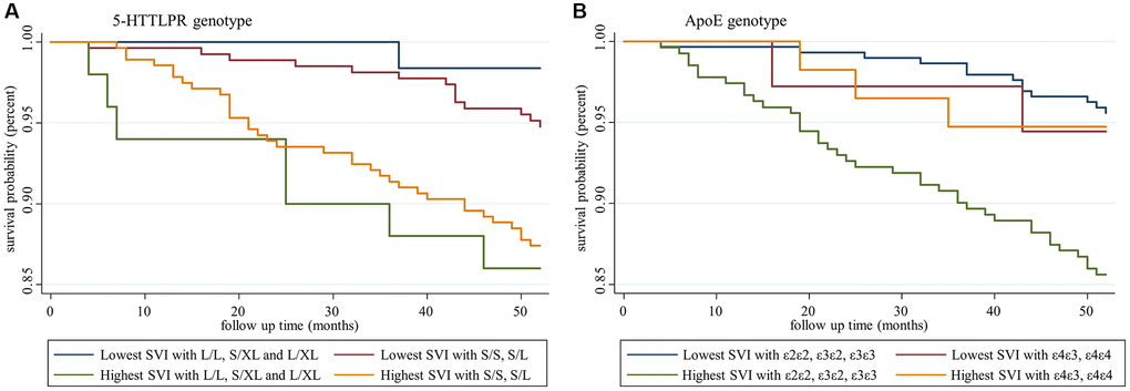 To further examine the genotype effects on SVI in predicting mortality, we chose the highest and lowest tertiles of SVI and 5-HTTLPR genotypes from four groups and performed Kaplan-Meier analysis. In Figure 4A, both lowest SVI groups with or without the short allele of 5-HTTLPR exhibited better survival than the highest SVI group, indicating that 5-HTTLPR had no moderation effect on SVI in predicting mortality. We performed a similar analysis for ApoE genotypes and found different results (Figure 4B). Kaplan-Meier analysis revealed significantly lower survival among participants with the highest SVI and without the ε4 allele. Other groups without the ε4 allele but lower SVI showed similar survival trends to those with the ε4 allele at all SVI levels. This effect suggested potential interaction effects of the ApoE genotype on SVI. Therefore, an interaction term was tested, and significant interaction effect was noted between ApoE and SVI but not between 5-HTTLPR and SVI (Table 3). The strata-specific hazard ratio based on the ApoE genotype was calculated, and a significant hazard ratio was found in the non-ε4 allele group, which showed a 15% increased risk of mortality per deficit increase in SVI (Table 4).