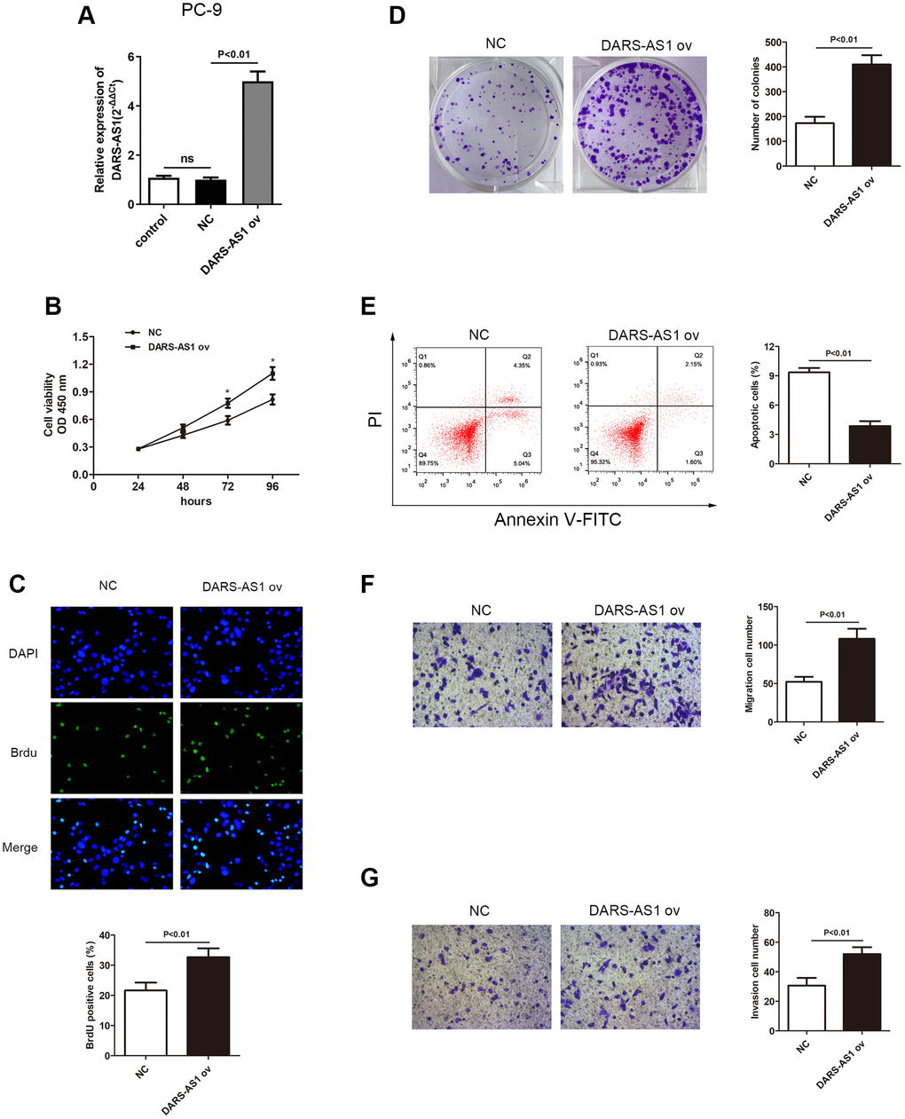 The enhanced expression of DARS-AS1 in LUAD tissues and cell lines suggested that it could act as a cancer-promoting gene in LUAD. An investigation was conducted to validate this assumption. The DARS-AS1 overexpression and silencing systems were constructed using DARS-AS1 ov and si-DARS-AS1, respectively. The A549 cell line was transfected with si-DARS-AS1 and PC-9 cells were transfected with DARS-AS1 ov because expression of DARS-AS1 was highest in A549 cells and lowest in PC-9 cells based on the preceding assay. After 48 h of transfection, the transcription level of DARS-AS1 was detected by qRT-PCR. The results revealed significant DARS-AS1 down-regulation in the si-DARS-AS1 group (Figure 2A, p < 0.05) and overexpression in the DARS-AS1 ov group (Figure 3A, p < 0.01). In order to investigate the effect of DARS-AS1 on LUAD cell proliferation, the CCK-8, BrdU, and colony-forming assays were performed. The findings demonstrated that DARS-AS1 silencing induced a decrease in cell viability in A549 cells (Figure 2B, *P < 0.05), while up-regulation of DARS-AS1 resulted in increased cell proliferation in PC-9 cells (Figure 3B, *p < 0.05). Meanwhile, BrdU staining showed that there was less duplicated DNA (green) in the si-DARS-AS1 transfected group (Figure 2C, p < 0.01), while overexpression of DARS-AS1 led to increased cell replication (Figure 3C, p < 0.01), indicating that lncRNA DARS-AS1 overexpression was capable of enhancing LUAD cell proliferation. In addition, the results of colony formation assay of the si-DARS-AS1 group (Figure 2D, p < 0.01) were similar to the CCK-8 and BrdU assays, showing increased cell proliferation. The DARS-AS1 ov transfected group exhibited increased cell proliferation (Figure 3D, p < 0.01). The investigation of the DARS-AS1 mechanism in enhancing cell proliferation was performed using flow cytometry (FCM). The FCM demonstrated that the si-DARS-AS1 transfected group had an elevated cell apoptosis ratio (Figure 2E, p < 0.01), while up-regulation of DARS-AS1 reduced cell apoptosis (Figure 3E, p < 0.01), indicating that DARS-AS1 could enhance LUAD cell proliferation by inhibiting cell apoptosis. Subsequently, cell migration and invasion of LUAD with different expression levels of DARS-AS1 were detected using the transwell chamber assay. As shown in Figure 2F and 2G, the transwell assay revealed that silencing of DARS-AS1 resulted in attenuated cell migration and invasion ability (p < 0.01), while overexpression of DARS-AS1 in PC-9 cells led to enhanced cell migration and invasion (Figure 3F and 3G, p < 0.01). These results indicated that lncRNA DARS-AS1 was involved in promoting LUAD progress.