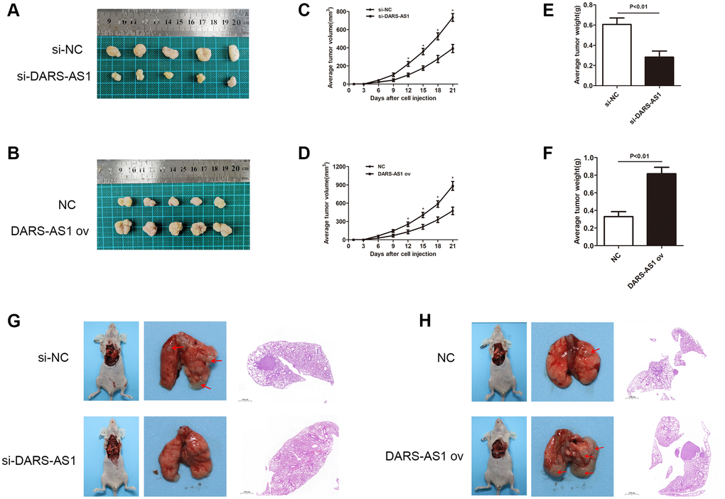 As LncRNA DARS-AS1 was confirmed as a cancer-promoting gene in LUAD in vitro through the above experiments, the effect of LUAD in vivo was examined through an animal study using nude mice. After injecting LUAD cells transfected with related plasmids (si-DARS-AS1, DARS-AS1 ov, and negative control) subcutaneously in the nude mice, the average tumor volume and weight were recorded. Figure 4A and 4B showed the LUAD tumor size in the si-DARS-AS1 or DARS-AS1 ov. groups. Consistent with the in vitro findings, knockdown of DARS-AS1 resulted in significantly smaller tumors compared to the negative control (Figure 4A), while DARS-AS1 overexpression resulted in bigger tumors (Figure 4B). Furthermore, DARS-AS1 silencing led to reduced tumor growth rate and weight (Figure 4C and 4E, *p < 0.05), while opposite effects were observed with the up-regulation of DARS-AS1 (Figure 4D and 4F, *p < 0.05).