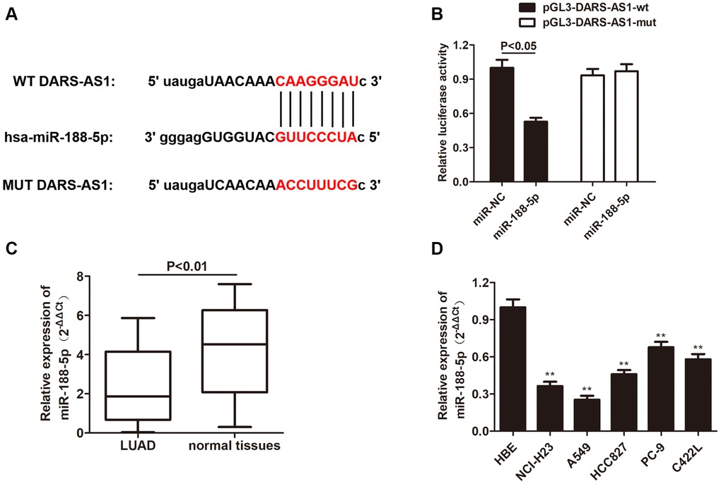 Although DARS-AS1 has been identified as a cancer-promoting gene of LUAD, the exact regulatory pathway remains unknown. In order to investigate the downstream target of DARS-AS1, starBase was applied and there was an overlapping sequence between miR-188-5p and DARS-AS1 (Figure 5A), indicating a direct interaction between these two factors. Following that, the hypothesis was confirmed by dual-luciferase activity; miR-188-5p significantly reduced the luciferase activity in A549 cells transfected with pGL3- DARS-AS1-wt plasmid compared to the control group, while the luciferase activity in A549 cell transfected with pGL3-DARS-mut exhibited no changes (Figure 5B, p < 0.05). QRT-PCR was performed to determine the transcription level of miR-188-5p in LUAD tissues and cell lines. The results revealed a down-regulation of miR-188-5p in both LUAD tissues and cell lines compared to normal tissues and the HBE cell line, respectively (Figure 5C and 5D, **p < 0.01), suggesting that aberrant low expression of miR-188-5p may have some pathological association with the development of LUAD.