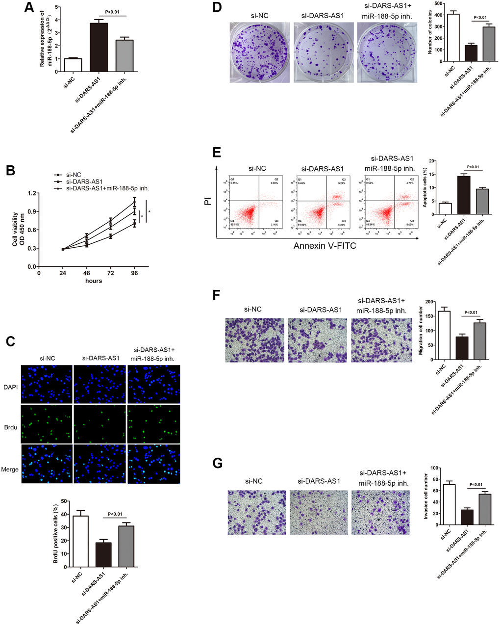 In order to further investigate miR-188-5p in LUAD, we used DARS-AS1 knockdown to determine its expression level in LUAD. The qRT-PCR results demonstrated that DARS-AS1 silencing induced up-regulation of miR-188-5p. However, when the miR-188-5p inhibitor and si-DARS-AS1 were given simultaneously, there was a decrease in miR-188-5p expression (Figure 6A, p < 0.01), indicating that miR-188-5p was possible a negative target of DARS-AS1. The CCK-8, BrdU, and colony formation assays were used to determine the functional role of miR-188-5p in LUAD. Compared to the DARS-AS1 silencing group, co-treating with the miR-188-5p inhibitor and si-DARS-AS1 significantly enhanced cell viability (Figure 6B, *p < 0.05). Similarly, findings from the BrdU and colony formation assays verified that knockdown of DARS-AS1 alone alleviated cell proliferation, but co-treating cells with the miR-188-5p inhibitor and si-DARS-AS1 improved cell viability (Figure 6C and 6D, p < 0.01). Flow cytometry and a transwell assay were also conducted to examine the effects of DARS-AS1 and miR-188-5p. According to FCM results, the miR-188-5p inhibitor and si-DARS-AS1 co-treated groups had a lower number of apoptotic cells compared to the solo si-DARS-AS1 group (Figure 6E, p < 0.01). In addition, the transwell assay was performed to determine the potentiated cell migration and invasive ability of cells that were given the miR-188-5p inhibitor and only si-DARS-AS1. The findings revealed that miR-188-5p inhibitor reserved the inhibition of A549 cell migration and invasion mediated by DARS-AS1 absence (Figure 6F and 6G, p < 0.01), indicating that miR-188-5p was a tumor suppressor in LUAD.