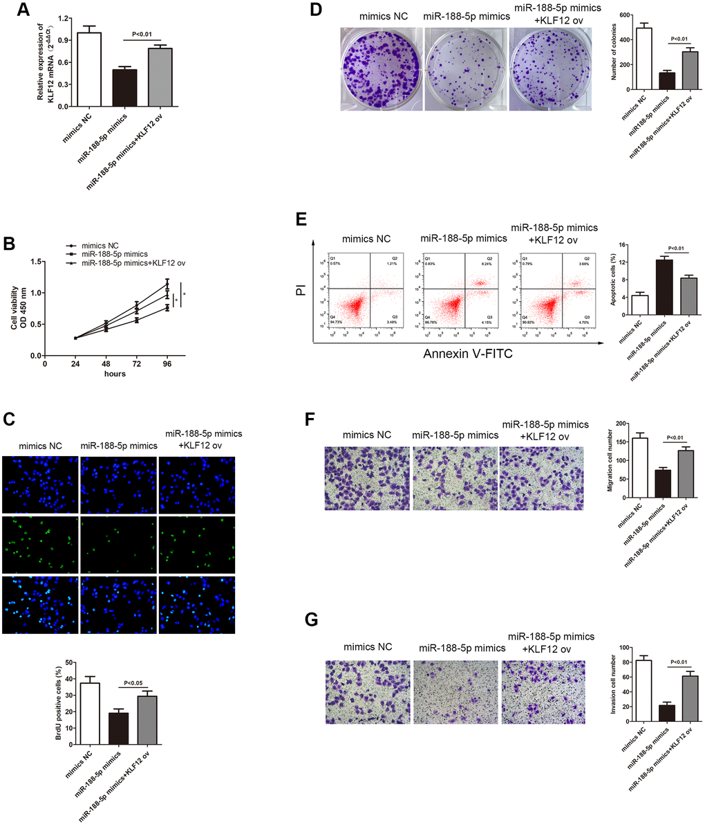 In order to study the relationship between KLF12 and miR-188-5p, the transcription level of KLF12 in LUAD cells was measured using miR-188-5p mimics. The qRT-PCR results showed that overexpression of miR-188-5p led to KLF12 silencing, but giving KLF12 ov subsequently reversed the effect of the miR-188-5p mimics (Figure 8A, p < 0.01). This finding revealed that KLF12 is negatively regulated by miR-188-5p. The CCK-8, BrdU, and colony formation assays showed that overexpression of KLF12 could promote cell growth (Figure 8B–8D), indicating that KLF12 could reverse the suppressive effect of miR-188-5p on LUAD. Furthermore, we found that KLF12 ov reserved the inhibition of A549 cell migration and invasion mediated by miR-188-5p mimics from the transwell assay (Figure 8F and 8G, p < 0.01). Flow cytometry results revealed a significant reduction in apoptosis ratio in the KLF12 ov + miR-188-5p mimics group when compared to the solo miR-188-5p mimics group (Figure 8E, p < 0.01). These findings suggested that KLF12 could reverse the effects of miR-188-5p and mainly functions as a factor that facilitates the progression of LUAD development.