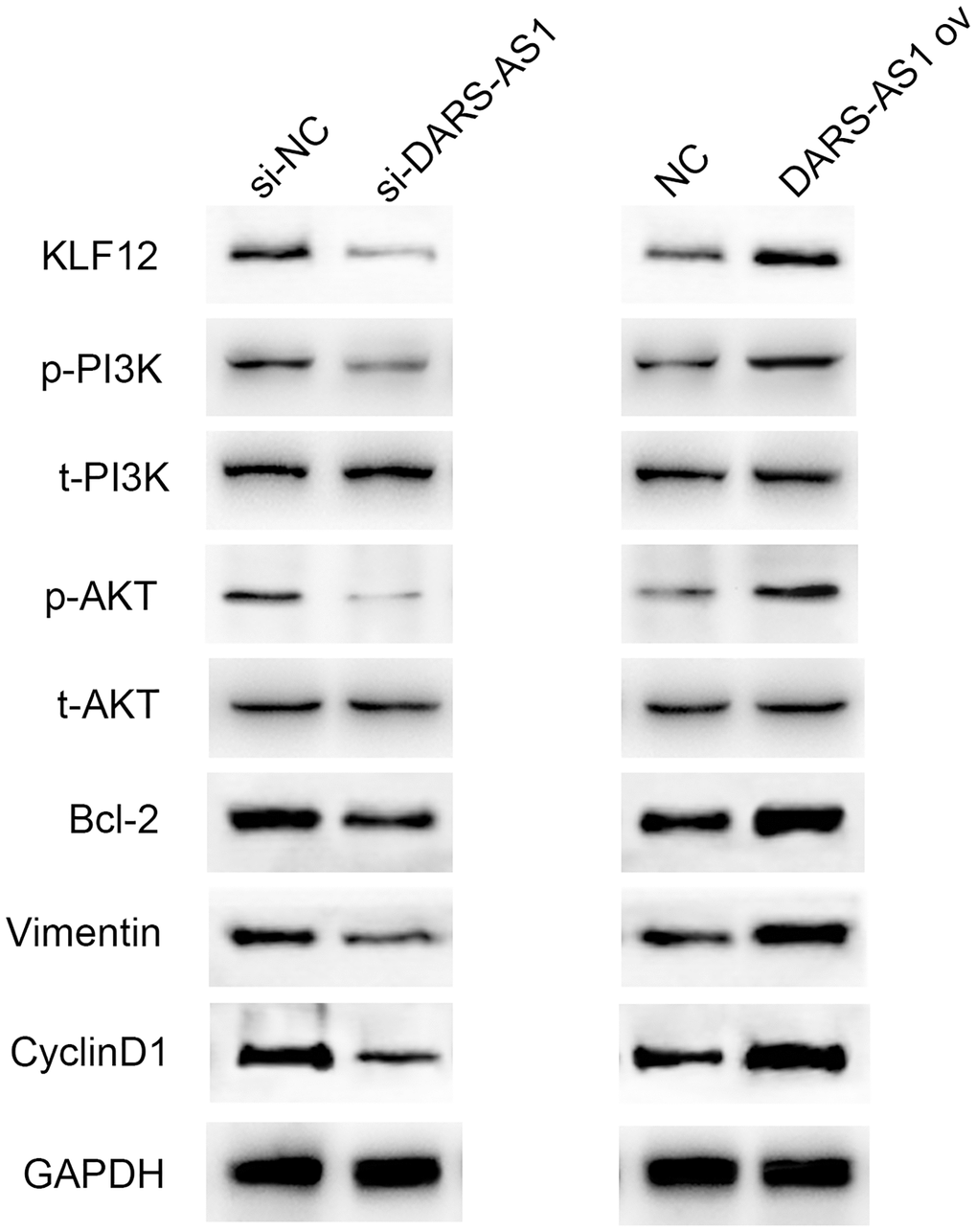 In order to further understand the regulatory pathway of DARS-AS1, several typical tumorigenesis pathways were selected to investigate whether they were regulated by DARS-AS1. Figure 9 displays the western blot results, which demonstrated that overexpression of DARS-AS1 induced up-regulation of KLF12, p-PI3K, p-AKT, Bcl-2, Vimentin, and CyclinD1, while DARS-AS1 silencing had the opposite effect. These findings confirmed that DARS-AS1 promoted the development of LUAD via activation of the PI3K/AKT pathway, inhibited cell apoptosis by up-regulating Bcl-2, and accelerated the EMT and cell cycle processes by overexpressing Vimentin and CyclinD1.
