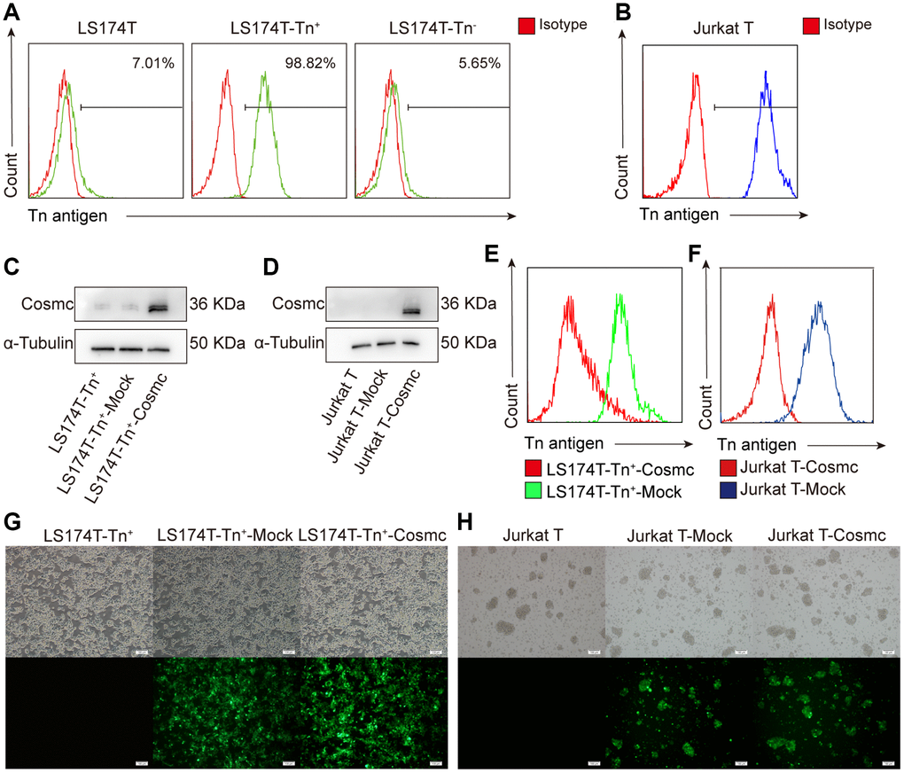 Previous studies have shown that Cosmc mutation decreases the activity of T-synthase and results in Tn antigen expression. According to the expression of Tn antigen on the cell surface, tumor cells were divided into Tn+ and Tn− cells. Using flow cytometry, it was found that there were approximately 7.01% Tn+ cells in human CRC cell line LS174T (Figure 1A) and almost 100% Tn+ cells in Jurkat T cells (Figure 1B). The Tn+ cells have been confirmed to exist in mutant Cosmc cells [20, 21] and in the absence of Cosmc protein.
