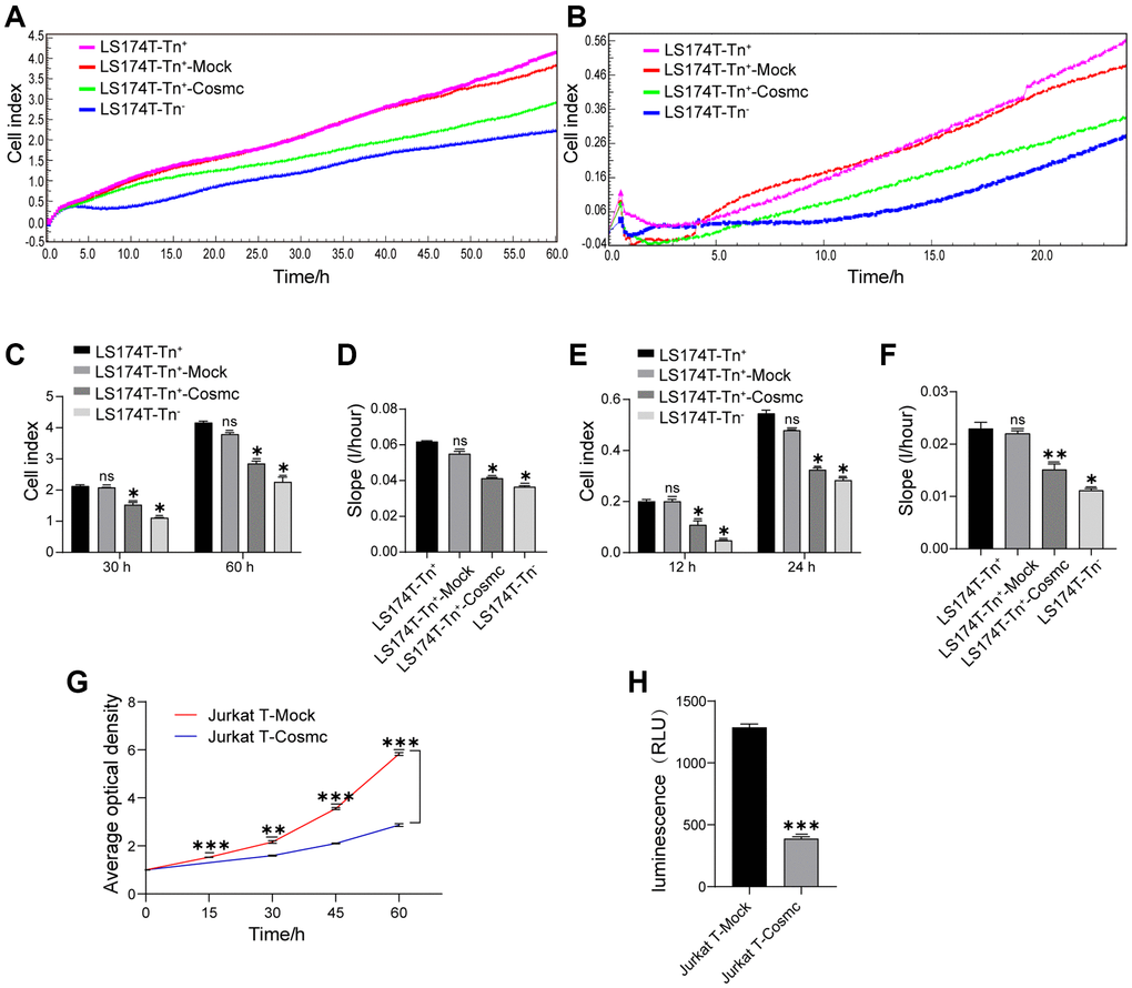 Proliferation of LS174T cells (LS174T-Tn−, LS174T-Tn+, LS174T-Tn+-Mock, and LS174T-Tn+-Cosmc) was observed at 5 min intervals continuously from 0 h to 60 h using a real-time cell DP Analyzer (RTCA, xCELLigence, ACEA Biosciences, CA, USA). Cells (2 × l04/well) in 100 μL of DMEM medium supplemented with 10% FBS and 1% penicillin-streptomycin were seeded in the E-plate and incubated at 37°C and 5% CO2. Cell index (CI) was recorded, which reflects changes in cell number at each timepoint. The rate of cell growth was calculated based on the slope of the line between two given timepoints.