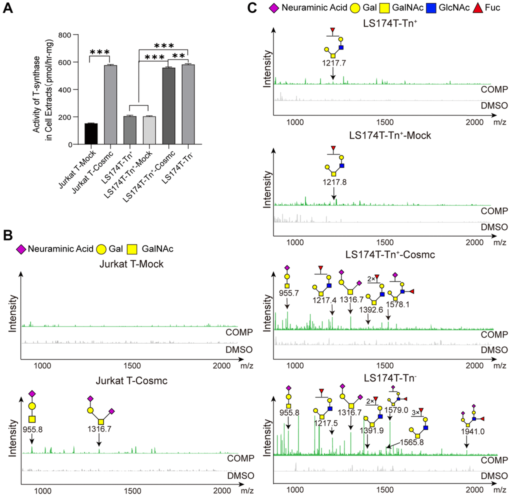 Cosmc is a molecular chaperone of T-synthase and is necessary for normal T-synthase activity, which participates in the correct extension of core 1-derived O-glycans. After transfection with WtCosmc, the activity of T-synthase was enhanced obviously (Figure 4A). Additionally, core 1-derived O-glycans (m/z: 955.4, 1316.6) appeared in Jurkat-T-Cosmc and LS174T-Tn+-Cosmc cells. Core 2-derived O-glycans (m/z: 1217.4, 1392.6, and 1578.1) based on core 1 structure were presented in LS174T-Tn+-Cosmc cells rather than in Jurkat T-Cosmc cells. This indicates that Jurkat T cells may have lower or lack of C2GnT activity.
