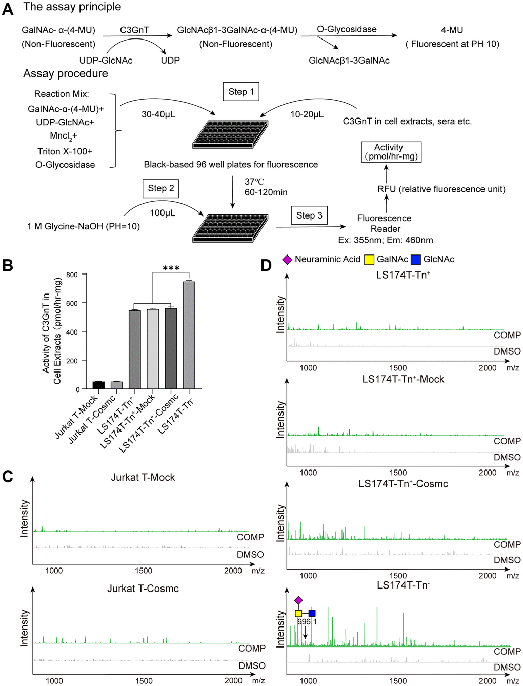 Extension of O-glycans is a complex process and requires the participation of glycosyl-transferase. The formation of core 1 structure requires T-synthase and Tn as substrates, and core 2 structure requires C2GnT and core 1-derived O-glycans as substrates. The formation of core 3 structure requires C3GnT, which mainly exists in gastrointestinal epithelia, and Tn as substrates. Using the new method presented here (Figure 5A), it was found that the activity of C3GnT in Jurkat T cells was slightly lower in LS174T-Tn+ cells than in LS174T-Tn− cells, which did not significantly change after transfection with WtCosmc (Figure 5B). Core 1-derived O-glycans (m/z: 955.4, 1316.6) appeared in Jurkat-T-Cosmc, LS174T-Tn+-Cosmc, and LS174T-Tn− cells. In contrast, core 3-derived O-glycans (m/z: 996.4) were only present in LS174T-Tn− cells (Figure 5C and 5D).