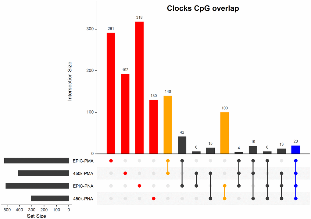 We identified four epigenetic clocks predictive of either PMA or PNA that are compatible with the Infinium MethylationEPIC BeadChip (EPIC) array or Infinium HumanMethylation450 BeadChip (450k) array. The number of CpGs within each clock range from 303-522 CpGs with varying degrees of overlap between the clocks (see Figure 2). CpGs for each NEOage clock with the corresponding coefficients to calculate DNAm age are provided in the Supplementary Material (Supplementary Tables 1–4 and Supplementary Code 1).