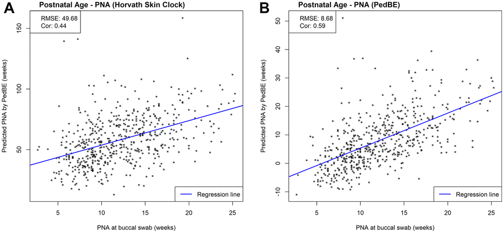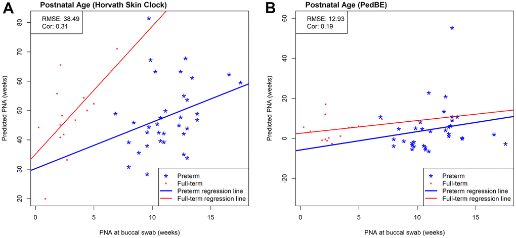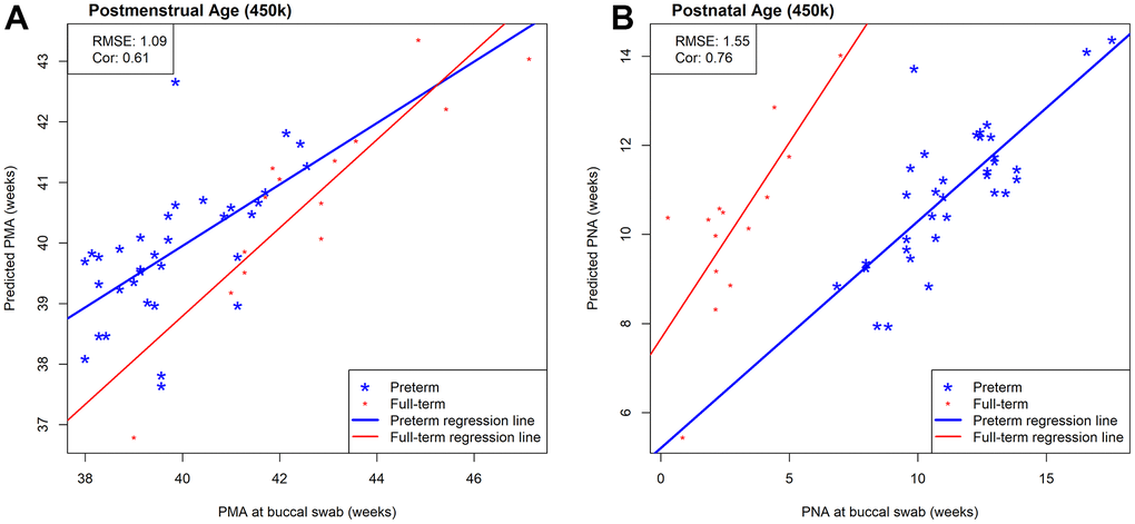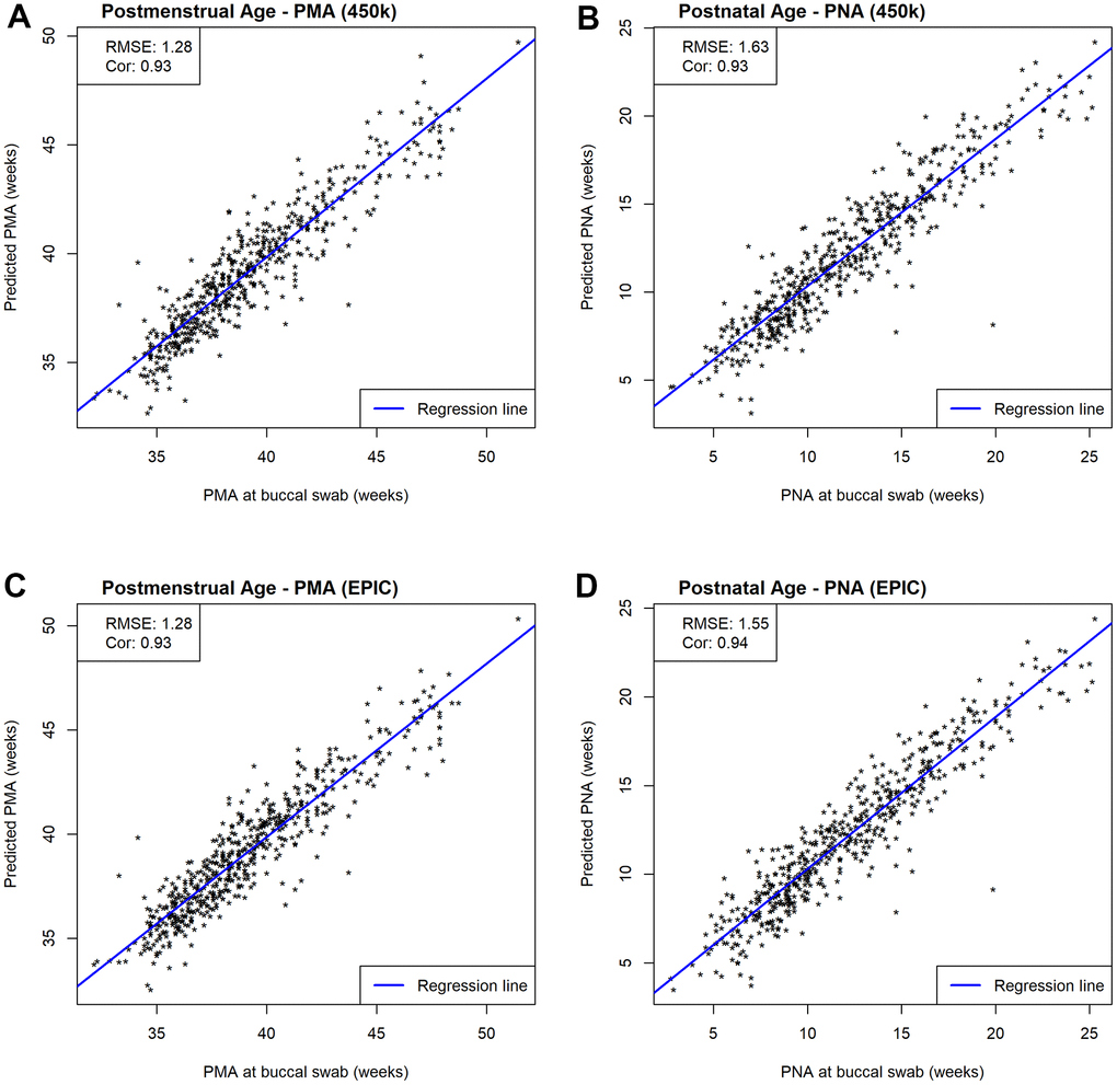 In addition, prediction performances of models trained using the complete (not LOO approach) 450k data set (450k NEOage clocks) were evaluated in an independent publicly available data set (GSE72120 [18]) that contained DNAm from the 450k array for 34 preterm and 14 full-term infants with information on PMA and PNA. This data set was chosen because to our knowledge it is the closest comparable data, but it is important to point out the difference between both data sets, as one measured DNAm of buccal swabs via the EPIC array and the other profiled DNAm in saliva using the 450k array. We evaluated the performance of our PMA-450k and PNA-450k NEOage clocks in the test sample by examining the correlation between predicted and measured outcomes. We also report the RMSE.