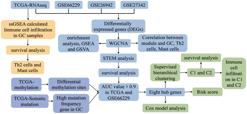 In the present study, we took gene expression data in GC from The Cancer Genome Atlas (TCGA) and Gene Omnibus (GEO) databases in order to search for prognostic genes and immune cells associated with GC development. To further explore dysregulated molecular mechanisms in GC, we performed enrichment analysis. Potential prognostic genes were evaluated using nomograms and risk scores. The effects of key genes on the survival of gastric cancer patients were validated by hierarchical clustering. These results may provide a new reference for predicting and understanding the prognosis of patients with gastric cancer.