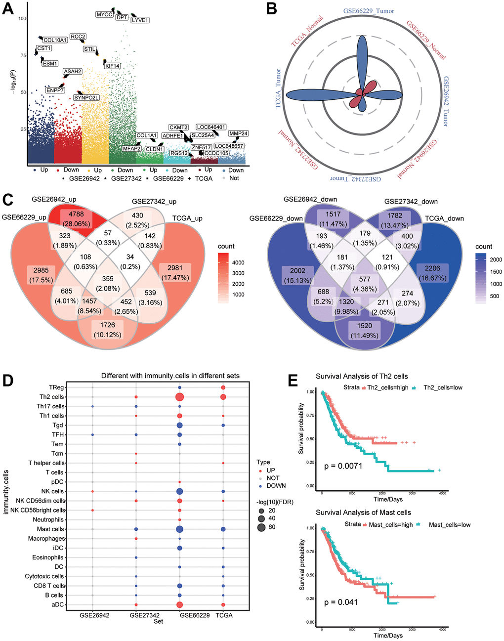Our results showed that Th2 and mast cells were significantly infiltrated in gastric cancer patients. Strong infiltration by Th2 cells may be associated with early carcinogenesis and promote the activation of a tumor microenvironment that favors angiogenesis and metastasis [33]. Studies have shown that Th2 cell responses are associated with the development and progression of human gastric cancer [34]. Our analysis showed that infiltration by mast cells was lower in GC than in controls in all three datasets. This contrasts with reports that mast cell infiltration increases in gastric cancer tissues [35, 36]. This difference may be explained by the small sample size of normal tissues in our data. Survival analysis previously showed that mast cell infiltration was associated with worse prognosis in gastric cancer [37].