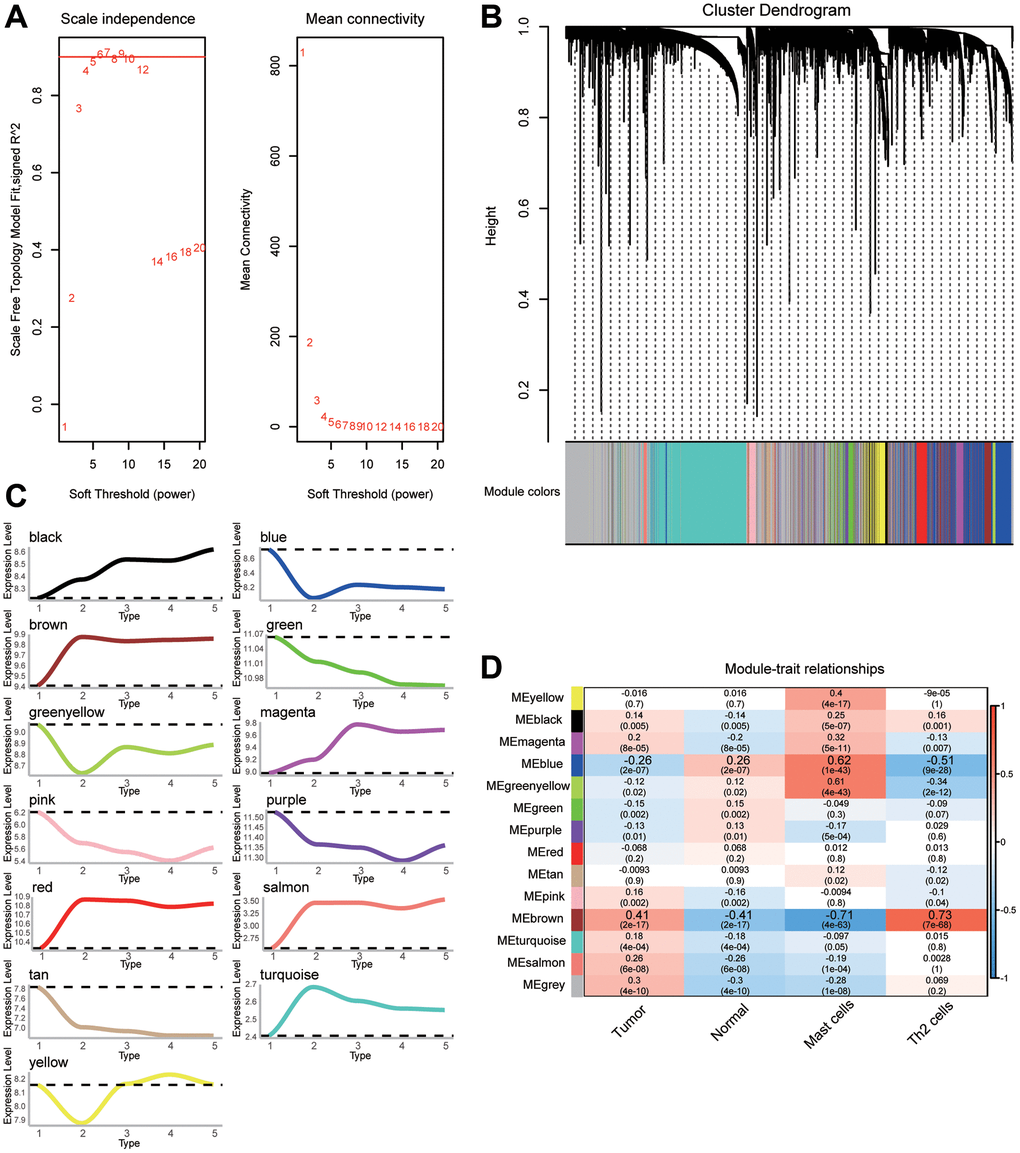 Common genes with | log2(fold change) | >0.5 were further screened to construct the coexpression network. β = 6 was chosen as the soft threshold power to construct a scale-free network (Figure 3A). We identified a total of 13 modules containing 4440 genes (Figure 3B). By correlating the expression of genes in modules to different stages of gastric cancer, we identified up- or downregulated modules (Figure 3C). Furthermore, the relationship between the modules and the clinical traits was evaluated to identify hub modules (Figure 3D). Significant correlations were found between modules and gastric cancer, as well as immune cells. Notably, the module named as 'blue' had the highest negative correlation with tumors and Th2 cells, but the highest positive correlation with normal and mast cells. The correlation between the brown module and traits was the opposite.