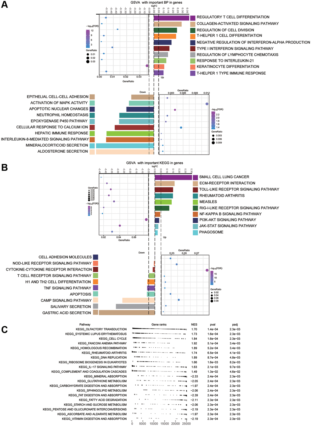 Performing enrichment analysis of module genes, we identified GO functions and KEGG signaling pathways associated with gastric cancer. Among the 1003 biological processes with P-value < 0.05, we found that “regulatory T cell differentiation”, “type I interferon signaling pathway”, “response to interleukin-21”, “inhibition of hepatic immune response”, “apoptotic nuclear changes”, and “activation of MAPK activity” were enriched (Figure 4A) Among the 116 KEGG pathways enriched for module genes, pathways involving PI3K-Akt, JAK-STAT, and Toll-like receptor (TLR) were activated, while pathways involving Th1 and Th2 cell differentiation, apoptosis, and tumor necrosis factor (TNF) were inhibited (Figure 4B). GSEA identified activation of the cell cycle and inhibition of gastric acid secretion in GC (Figure 4C).