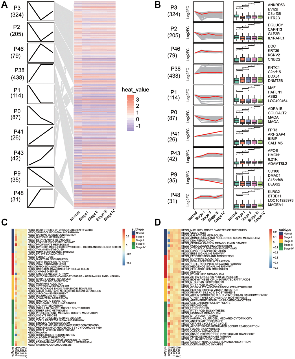 Clustering of module genes by STEM software according to the development of gastric cancer revealed 10 groups of clusters with different dynamic gene expression patterns (Figure 5A and 5B). We found 1381 genes that exhibited consistently up- or downregulated expression patterns during the development of gastric cancer. SubtypeGSEA showed that TLR signaling pathway, mRNA surveillance pathway, and rheumatoid arthritis pathway were consistently activated with the development of gastric cancer, while histidine metabolism, alpha linolenic acid metabolism, and peroxisomes were consistently inhibited (Figure 5C and 5D).