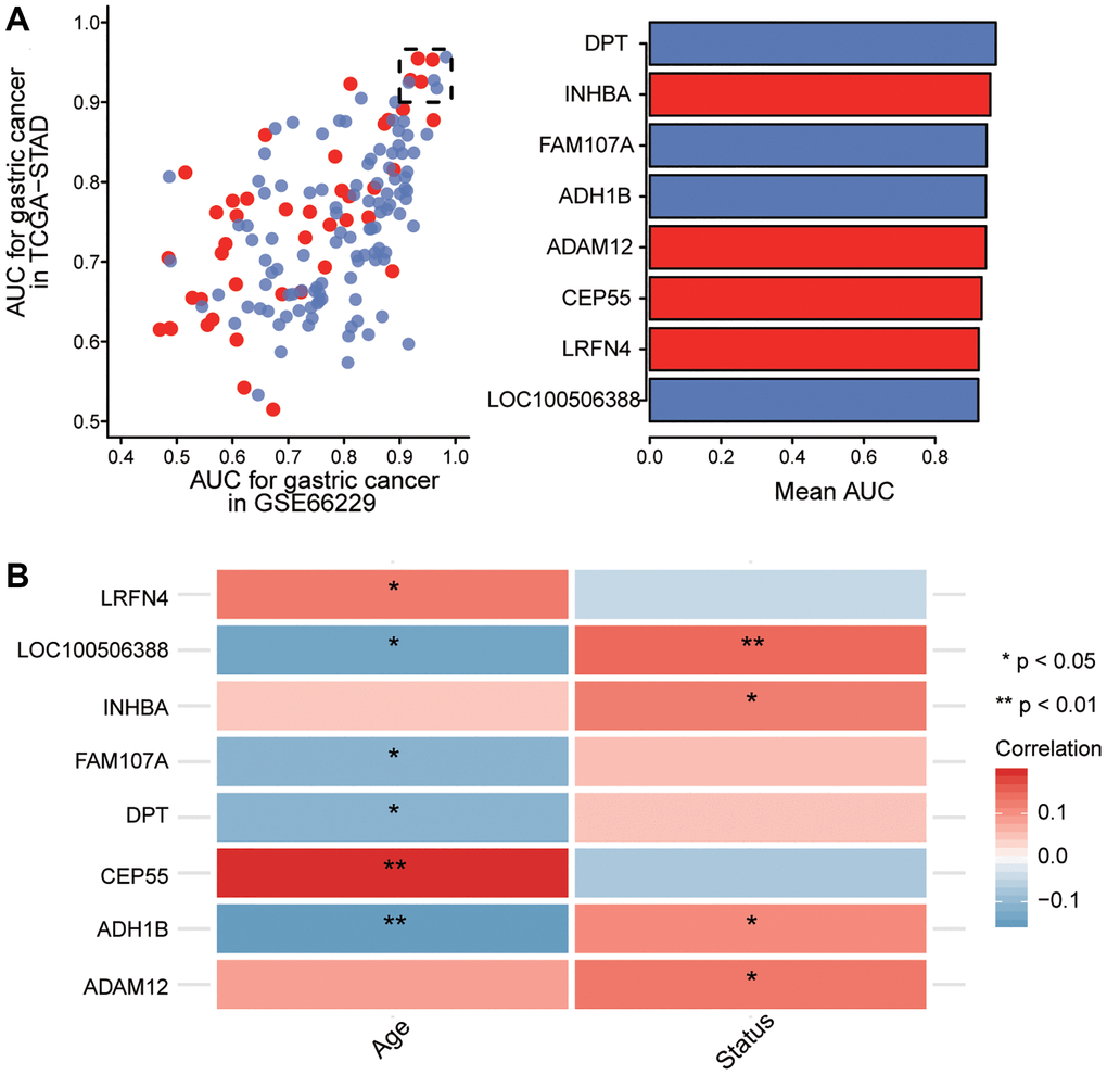 Principal component analysis found that the TCGA and GSE66229 data showed the greatest separation between tumor and normal samples (Supplementary Figure 1). We selected survival-related genes with AUCs greater than 0.9 as key genes (Figure 6A). Compared with normal tissues, ADAM12, CEP55, LRFN4, and INHBA were up-regulated in gastric cancer samples, while ADH1B, DPT, FAM107A, and LOC100506388 were downregulated. In addition, our correlation analysis showed that key gene expression was significantly associated with age and overall survival of GC patients (Figure 6B). Interestingly, ADH1B, DPT, FAM107A, and LOC100506388 belonged to the blue module, whereas CEP55 and LRFN4 belonged to the brown module.