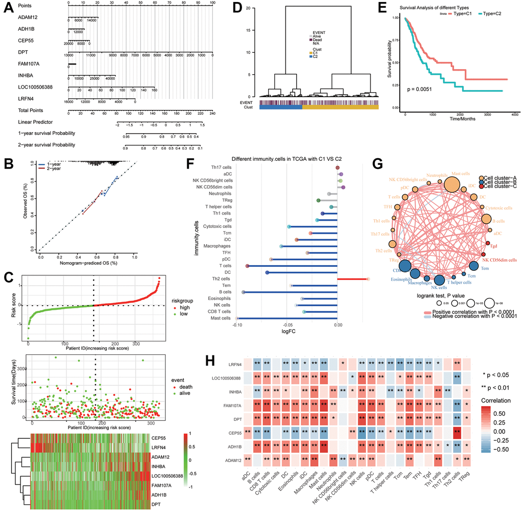 Risk scores were calculated based on the expression of key genes, and the median risk score was used to classify patients into high- or low-risk groups. The results showed that ADAM12, INHBA, LOC100506388, FAM107A, and ADH1B were upregulated in the high-risk group, while CEP55 and LRFN4 were highly expressed in the low-risk group (Figure 7C).