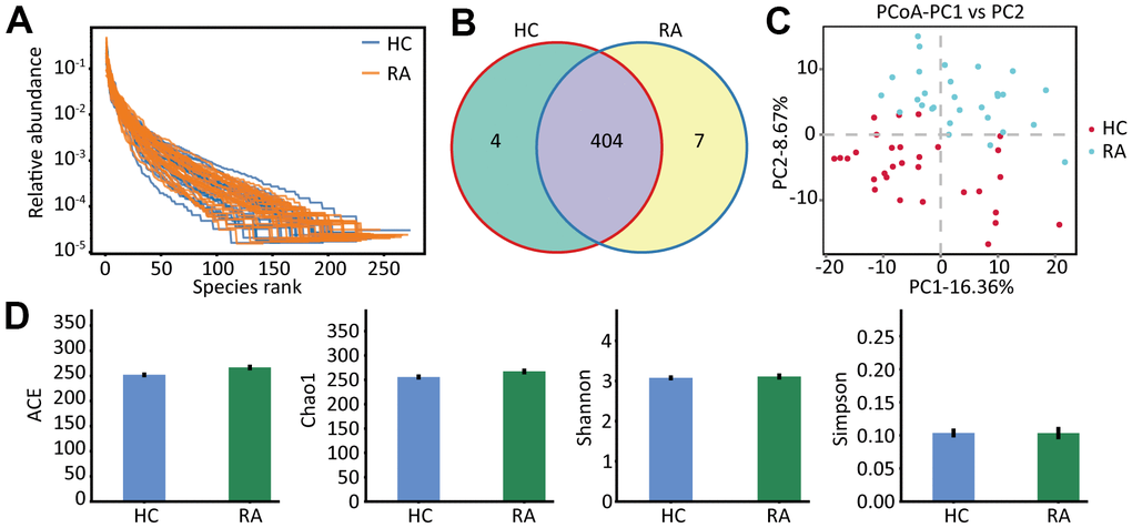 Gut microbiota profiles of the healthy subjects and the RA patients were analyzed by 16S rRNA gene sequencing. We observed that both the richness and the evenness of the gut microbiota were high in the HC and RA groups (Figure 1A), indicating that we can obtain sufficient sequencing information from these samples in the two groups. After data filtering, we obtained 4241288 clean tags, 2177148 of which were from the HC group (range, 68085 to 74519) and 2064140 of which were from the RA group (range, 50304 to 76306). Then, we carried out operational taxonomic units (OUTs) taxonomic analysis and acquired 408 and 411 OTUs from the HC group and RA group, respectively, and among these OTUs, 404 OTUs were shared by the HC and RA groups (Figure 1B). Principal coordinate analysis (PCoA) score analysis showed that the HC and RA samples were distributed in two groups (Figure 1C). The α-diversity analysis of the ACE, Chao1, Shannon and Simpson indices showed no significant differences between the HC and RA groups (Figure 1D). Specifically, Chao1 and Ace reflect the species richness of samples, namely, the amount of species. Shannon and Simpson indices reflect the species diversity of the samples. However, β-diversity analysis showed significant differences between the HC and RA groups, which was significant according to PERMANOVA (p = 0.001) and ANOSIM analysis (p =0.001), as showed in Supplementary Figure 1.
