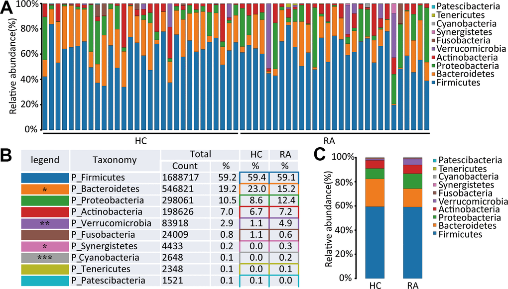 A total of 10 phyla in the intestinal flora were identified by 16S rRNA sequencing of the HC and RA groups. Firmicutes, Bacteroidetes, Proteobacteria and Actinobacteria were the main components of the HC and RA groups, as shown in Figure 2A. Firmicutes was the most predominant phylum, accounting for 59.4% and 59.1% of the species identified in the HC and RA groups, respectively. Bacteroidetes was more abundant in the HC group than in the RA group (23.0% versus 15.2%, respectively, p=0.0132), while Proteobacteria (8.6% versus 12.4% in the HC and RA groups, respectively) and Verrucomicrobia (1.1% versus 4.9% in the HC and RA groups, respectively, p=0.0075) were less abundant in the HC group than in the RA group (Figure 2B, 2C). Then, to assess differences in the microbiota of the HC and RA groups, we conducted a Wilcoxon test. According to the criterion of a p value<0.05, we found that Bacteroidetes, Cyanobacteria, Synergistetes and Verrucomicrobia were significantly different phyla between the HC and RA groups.