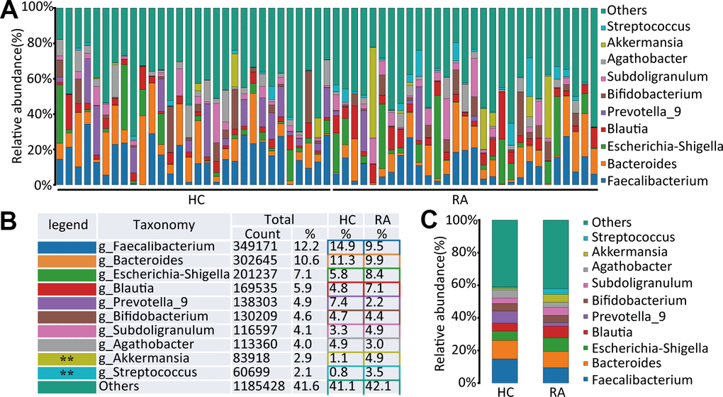 At the genus level, Faecalibacterium, Bacteroides, Escherichia-Shigella, Blautia, Prevotella_9, Bifidobacterium, Subdoligranulum, Agathobacter, Akkermansia, and Streptococcus were the main components of the HC and RA groups, as shown in Figure 3A–3C. Of them, Streptococcus (0.8% versus 3.5%, respectively, p=0.0013) and Akkermansia (1.1% versus 4.9%, respectively, p=0.0093) were significantly different genera between the HC and RA groups. A total of 159 bacterial genera were obtained between the HC and RA groups, of which 62 genera were less abundant in the RA group, including g_uncultured_bacterium_f_Prevotellaceae, g_Prevotella, g_Faecalibacterium, g_Bifidobacterium, g_Bacteroides, g_Ruminococcus_1, g_Ruminococcaceae_UCG-002, g_Lachnospiraceae_UCG-001, and g_Fusobacterium, while 97 genera were more abundant in the RA group, including g_Lactobacillus, g_Streptococcus, g_Akkermansia, g_Blautia, and g_Eggerthella. In addition, 43 of 159 genera were significantly different (p<0.05) between the HC and RA groups (Supplementary Table 1).