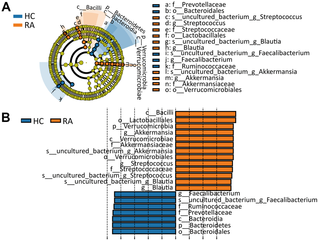 By the LEfSe (linear discriminant analysis effect size) method [16] and according to the filter criterion of “LDA score>4”, biomarkers with significant differences between the HC and RA groups were identified. In the cladogram and histogram in Figure 4A, 4B, circles moving from the inside to the outside of the cladogram represent the taxonomic level from phylum to species, and the diameter of each small circle is proportional to the relative abundance in the gut microbiota. The letters p, c, o, f, g and s represent phylum, class, order, family, genus and species, respectively. From the phylum to species classification levels, a total of 20 significantly different components of the intestinal flora (LDA score>4) between the HC and RA groups were identified. Among these components, p_Verrucomicrobia, c_Verrucomicrobiae, c_Bacilli, o_Verrucomicrobiales, o_Lactobacillales, f_Streptococcaceae, f_Akkermansiaceae, g_Blautia, g_Akkermansia, g_Streptococcus, s_uncultured_bacterium_g_Blautia, s_uncultured_bacterium_g_Akkermansia and s_uncultured_bacterium_g_Streptococcus were more abundant in the RA group, while p_Bacteroidetes, c_Bacteroidia, o_Bacteroidales, f_Ruminococcaceae, f_Prevotellaceae, g_Faecalibacterium and s_uncultured_bacterium_g_Faecalibacterium were more abundant in the HC group.