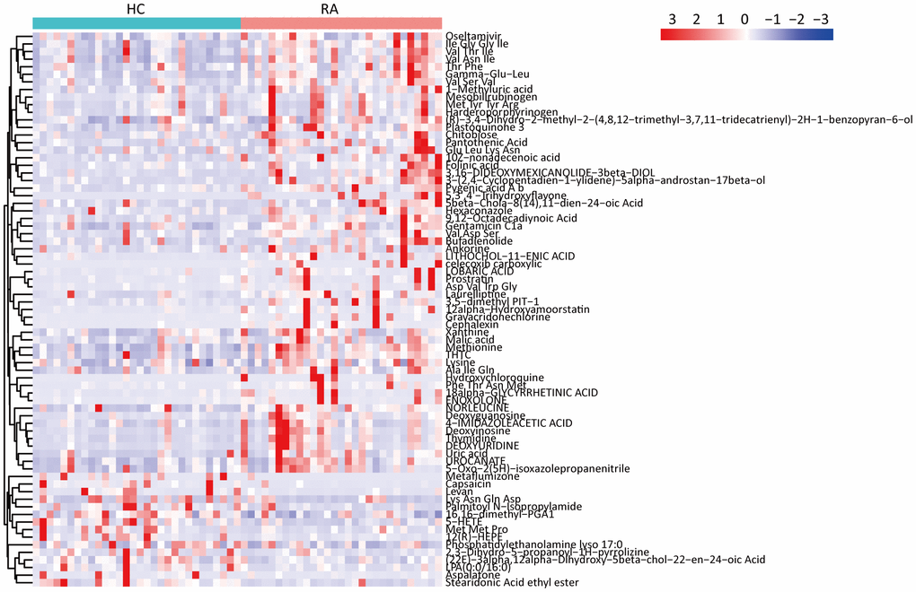 Identification of differentially abundant metabolites between the HC and RA groups