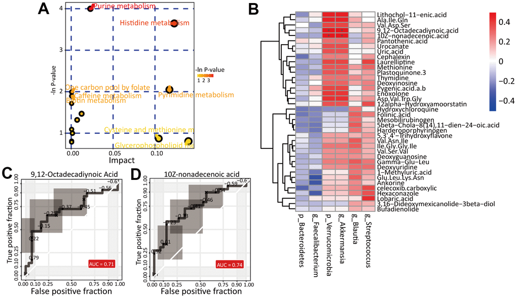 Then, we analyzed the pathways enriched in the differentially abundant metabolites mentioned above with the MetaboAnalyst website (https://www.metaboanalyst.ca/), the results of which are shown in Figure 6A. We found two pathways significantly enriched in the metabolites: the purine metabolism (p=0.01 and impact value=0.02) and histidine metabolism (p=0.02 and impact value=0.12) pathways. The metabolites xanthine, deoxyinosine, deoxyguanosine and uric acid were enriched in the purine metabolism pathway, while the metabolites urocanate and 4-imidazolaetic acid were enriched in the histidine metabolism pathway. These results suggest that alteration of the fecal microbiota leads to metabolic pathway alterations, especially in nucleic acid metabolism and amino acid metabolism.