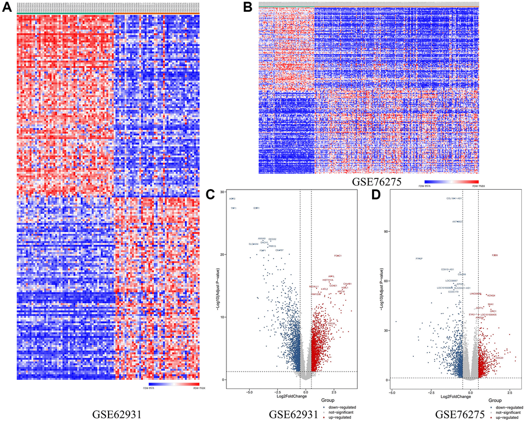 We used Limma library in R studio and input the code to get the differentially expressed genes (DEGs). The log Fold Change was higher than or equal to 2 and the adjust P-value was less than 0.05. Then we used Morpheus website (https://software.broadinstitute.org/morpheus/) to make the Heat maps of these 2 databases. Meanwhile, we used the Limma library again and input the relevant code to get the Volcano plots. These figures were performed with P-value <0.05 was defined. The log change >0.5 folds of genes were regarded as up-regulated DEGs and log change <−0.5 folds of genes were regarded as down-regulated DEGs, while others were not-significant DEGs. We also labeled the most significant 20 DEGs in Volcano plots. We also get Venn plots by using https://bioinfogp.cnb.csic.es/tools/venny/index.html to get the DEGs which existed in both GSE62931 and GSE76275 databases.