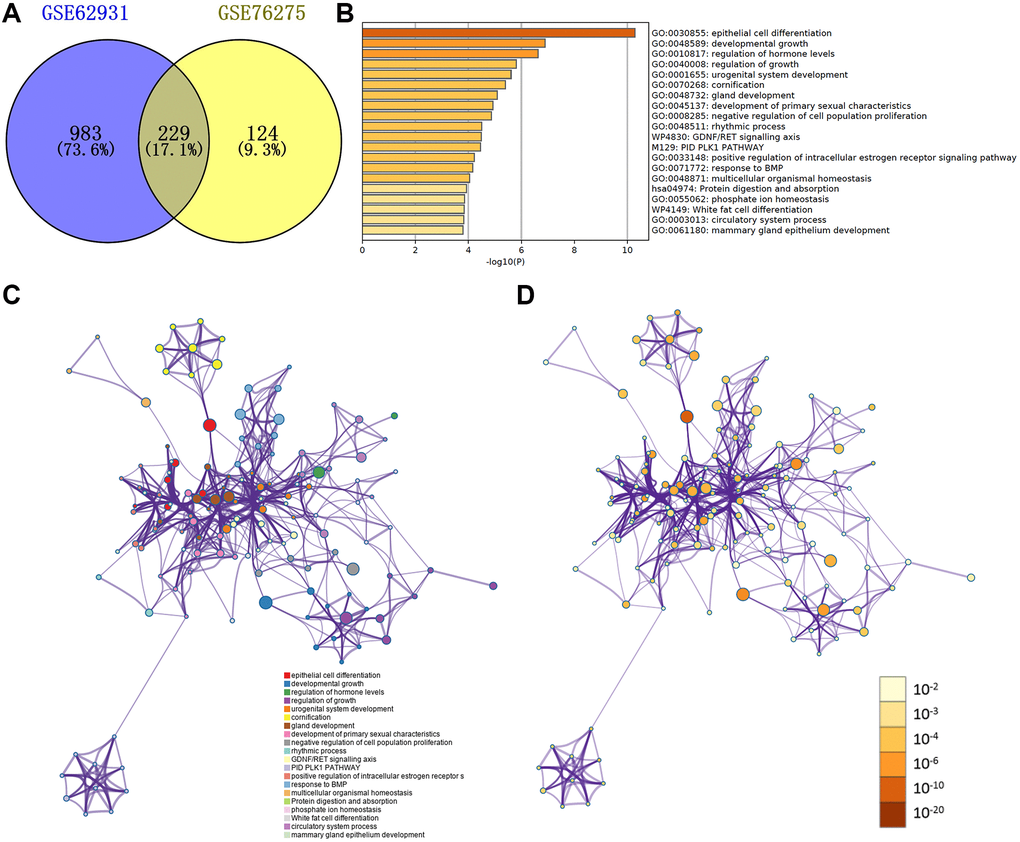 We used metascape website to make the functional and pathway enrichment analysis (Figure 3B–3D, Supplementary Table 1). The enrichments of DEGs were mostly in ‘epithelial cell differentiation’, ‘developmental growth’, ‘regulation of hormone levels’, ‘urogenital system development’ and ‘regulation of growth’. Figure 3C and 3D were respectively colored by cluster ID and P-value.