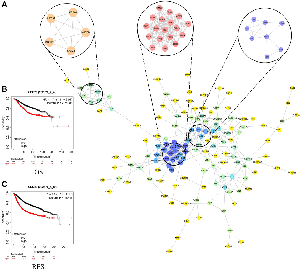 We used Kaplan website (https://kmplot.com/analysis/) to analyze the survival curve. This website is constructed based on gene microarray and RNA-seq data from public databases such as TCGA and GEO. And it assessed the survival impact of more than 50000 genes across 21 types of cancer, including breast cancer. The Kaplan website integrates gene expression information and clinical prognostic value for meta-analysis and the study, discovery and validation of molecular markers related to survival. We input the 20 hub genes and got the overall survival (OS) and recurrence-free survival (RFS) of these 20 hub genes in breast cancer.