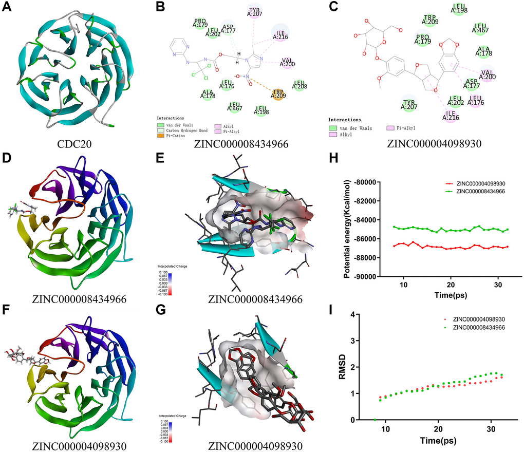 Stability was very significant in drug development, so we use molecular dynamic simulation module to analyze the stability of ZINC000004098930-CDC20 and apcin-CDC20 complexes. We got the potential energy and RMSD curves of these complexes by molecular docking experiment (Figure 5H and 5I). After 18 ps, the ZINC000004098930-CDC20 and apcin-CDC20 complexes’ trajectories reached equilibrium, and gradually being stabilized with time going by. In conclusion, these two complexes could be stable in natural circumstances.